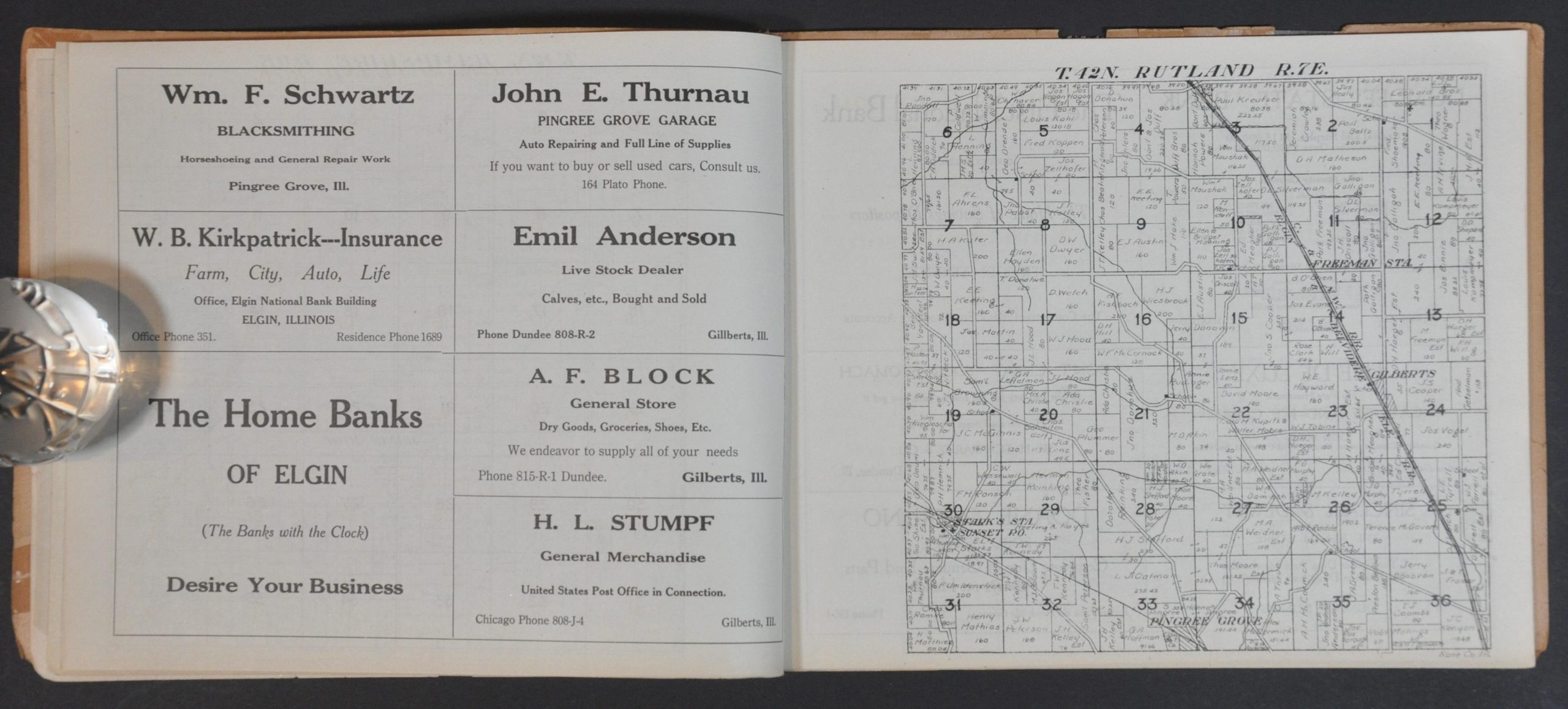 This fascinating atlas of Kane County, Illinois was published by the Elgin Daily News in 1920, with plat maps by W.W. Hixson & Co. of Rockford and printing by Lowrie & Black Co.