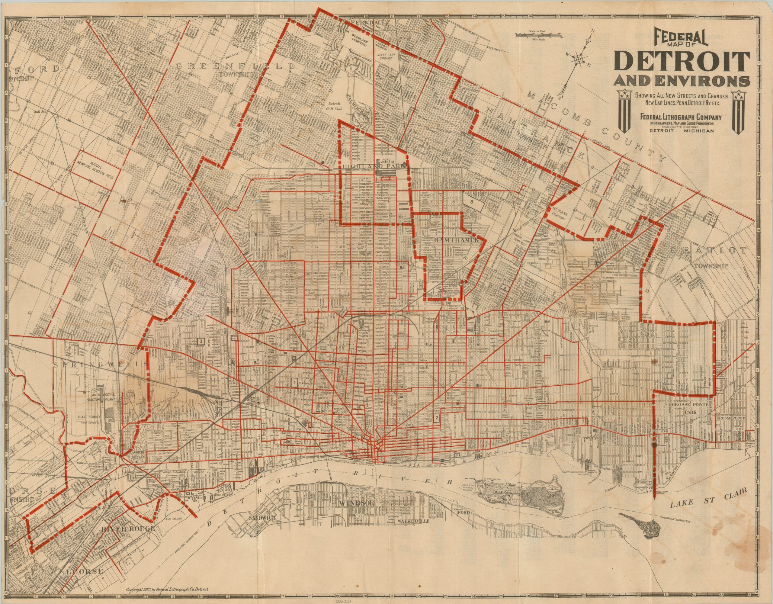 This interesting 1923 map of Detroit, Michigan was published locally by the Federal Lithograph Company. The city was well on its way to earning the nickname ‘The Motor City’, with several automotive firms bringing in large quantities of employees. Massive Ford plants can be seen in Highland Park and Springwells, with smaller factories in operation by Cadillac, Maxwell, Lincoln, and the Dodge Brothers.