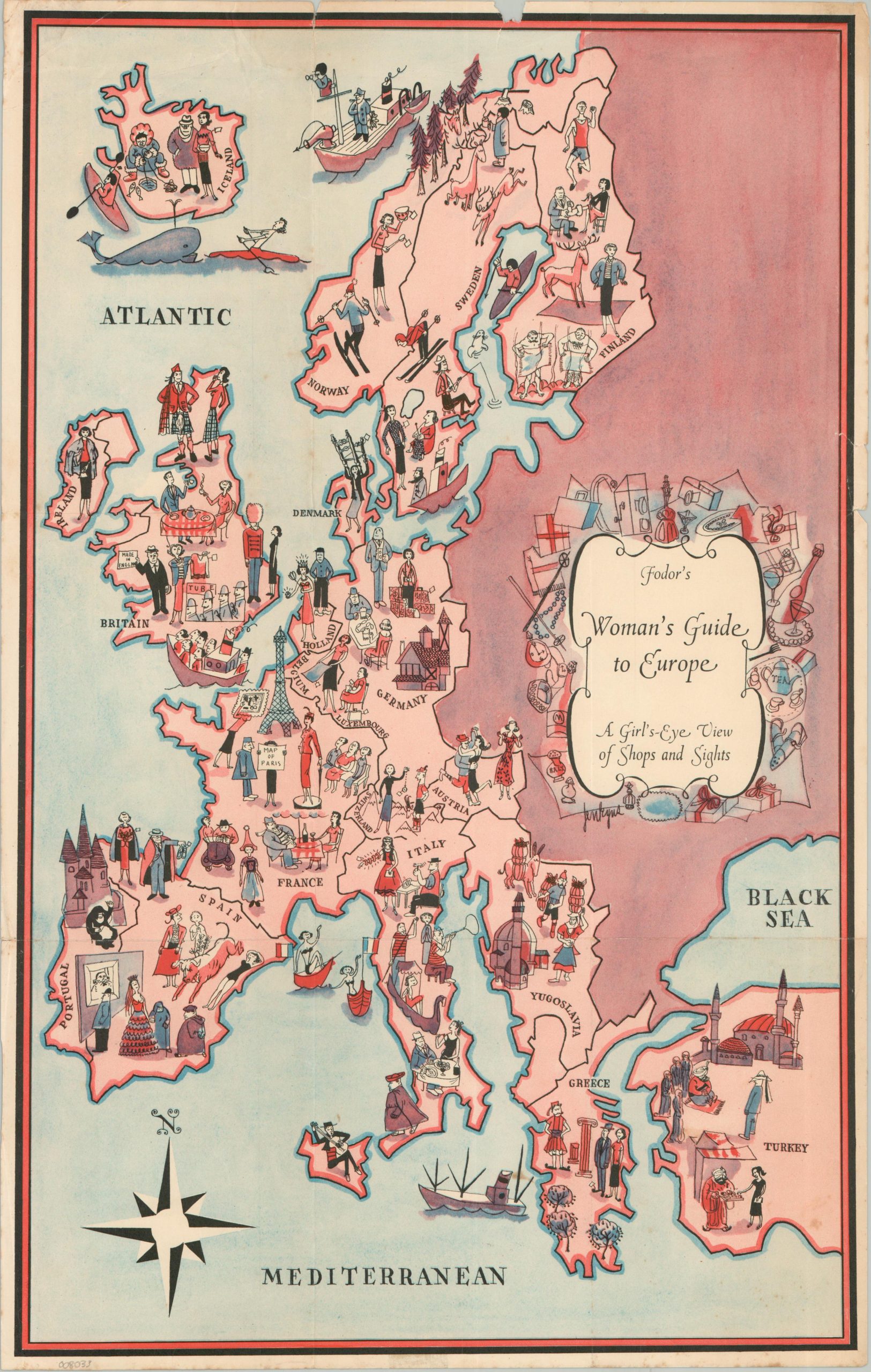 This glamorous map of Europe was issued as part of a Fodor’s tourist guide during the early 1950s. While it shares many characteristics of the popular pictorial maps of the 20th century, the subject matter is uncommon. The vibrant colored image offers a ‘feminine’ view of the continent, emphasizing fashion, the arts, dining, and shopping. Dozens of pictorial vignettes showcase regional highlights from Scandinavia to Anatolia, including steamy hunks in Finland, tartan styles in Scotland, teatime in England, and tempting Turkish pastries.