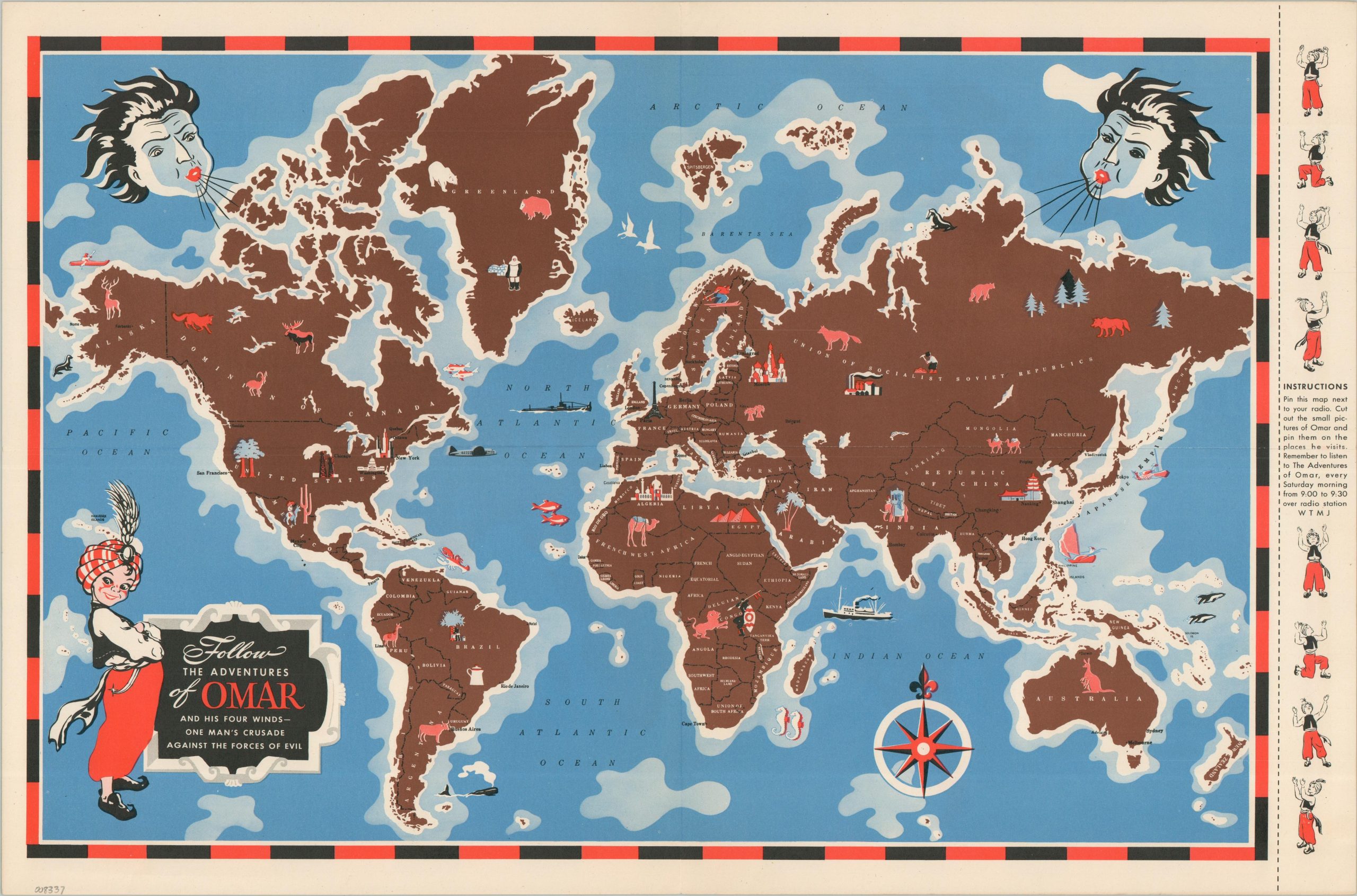 This whimsical pictorial map, titled Follow the Adventures of Omar, serves as a colorful relic of the Golden Age of Radio. Published around 1940 as a promotional premium for Omar Wonder Flour, the map was designed to accompany the serialized radio drama broadcast on WTMJ Milwaukee every Sunday morning from 9 to 9:30.