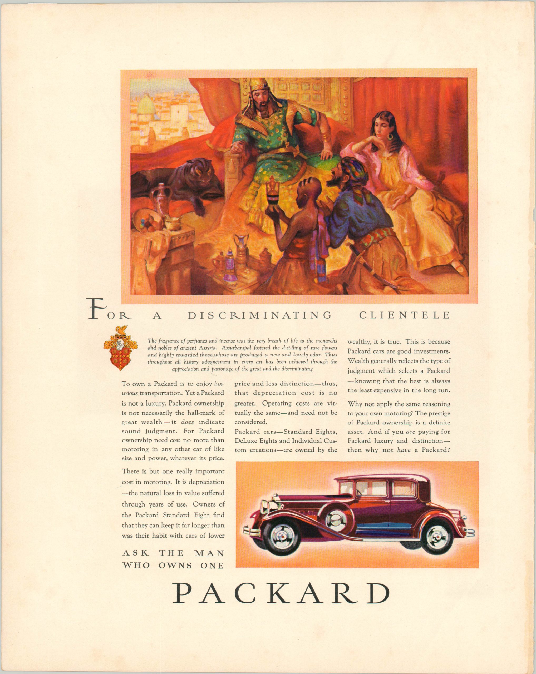 “To own a Packard is to enjoy luxurious transportation” claims this automobile advertisement, published in a 1933 issue of Fortune magazine. The text continues to describe how the Packard is not a luxury and can be afforded by most, but rather that ownership displays prestige and sound judgment typical of the wealthy.