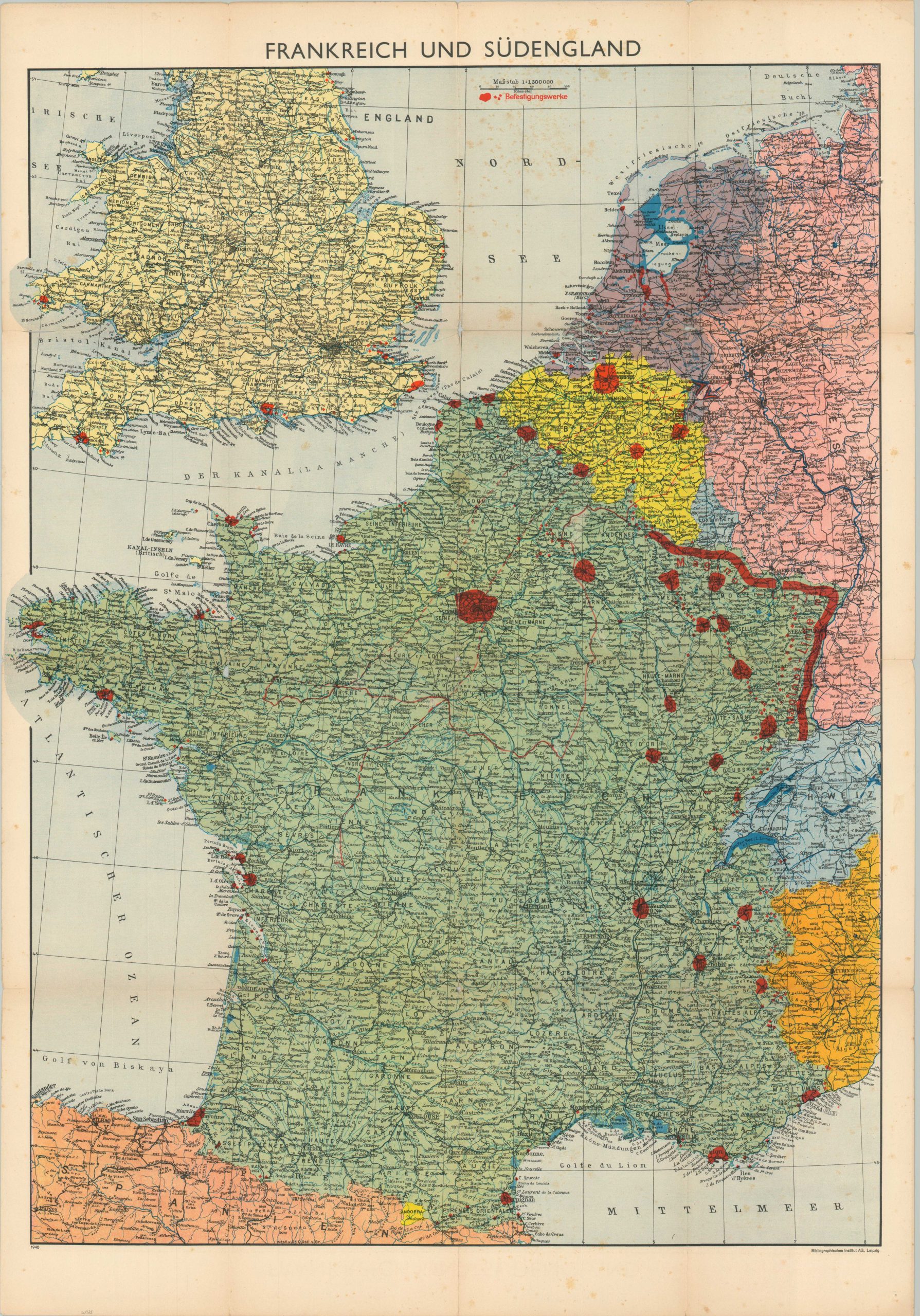 This German map of France and southern England was published in Leipzig in early 1940 by the Bibliographisches Institut AG for use by members of the Wehrmacht (German military forces). A simple political base map noting transportation routes, geographic features, and major cities is overprinted with red ink highlighting major fortified areas across the theater of conflict. The formidable Maginot Line is heavily emphasized, while further red lines (possibly indicating specific unit routes) have been added by hand in red pencil.