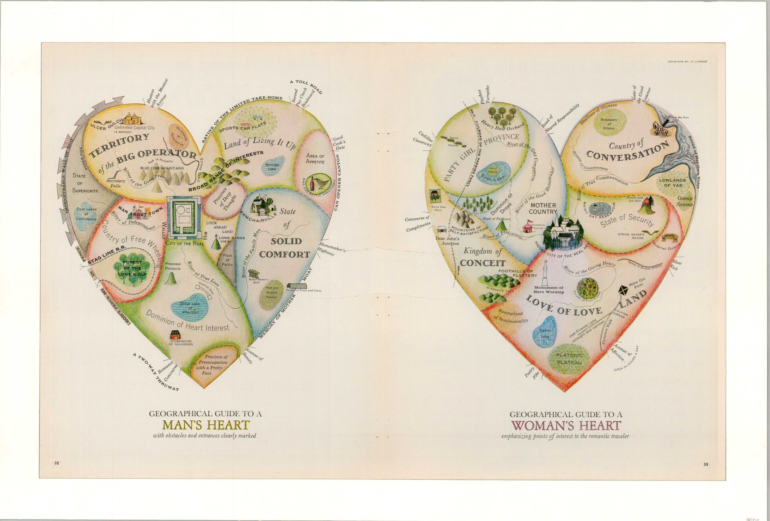 Each map vividly captures the contemporary notions of romance for males and females in the 1960’s. The center of a man’s heart is dominated by a fortified city and surrounded by lands relating to a variety of romantic concepts, not just love. These include the Country of Free Wheeling, the State of Solid Comfort, and the Impenetrable Wall of Ego. Small cartoons and annotations reference the interplay between these ‘geographic’ locations, including possible avenues for entry around the outer border.