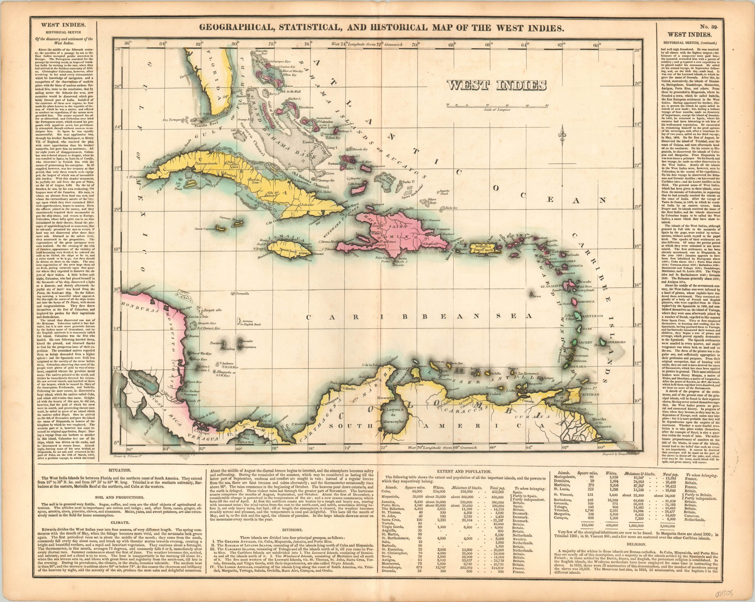 Surrounding the image are numerous blocks of text outlining the climate, geography, history and political organization of the West Indies; including a table of the islands with demographics and “to whom belonging.” The map was drawn by Fielding Lucas, Jr. and engraved by Young & Delleker. It was included as sheet number 39 in the 1822 (first) edition of Carey & Lea’s Complete Historical, Chronological, and Geographical American Atlas.