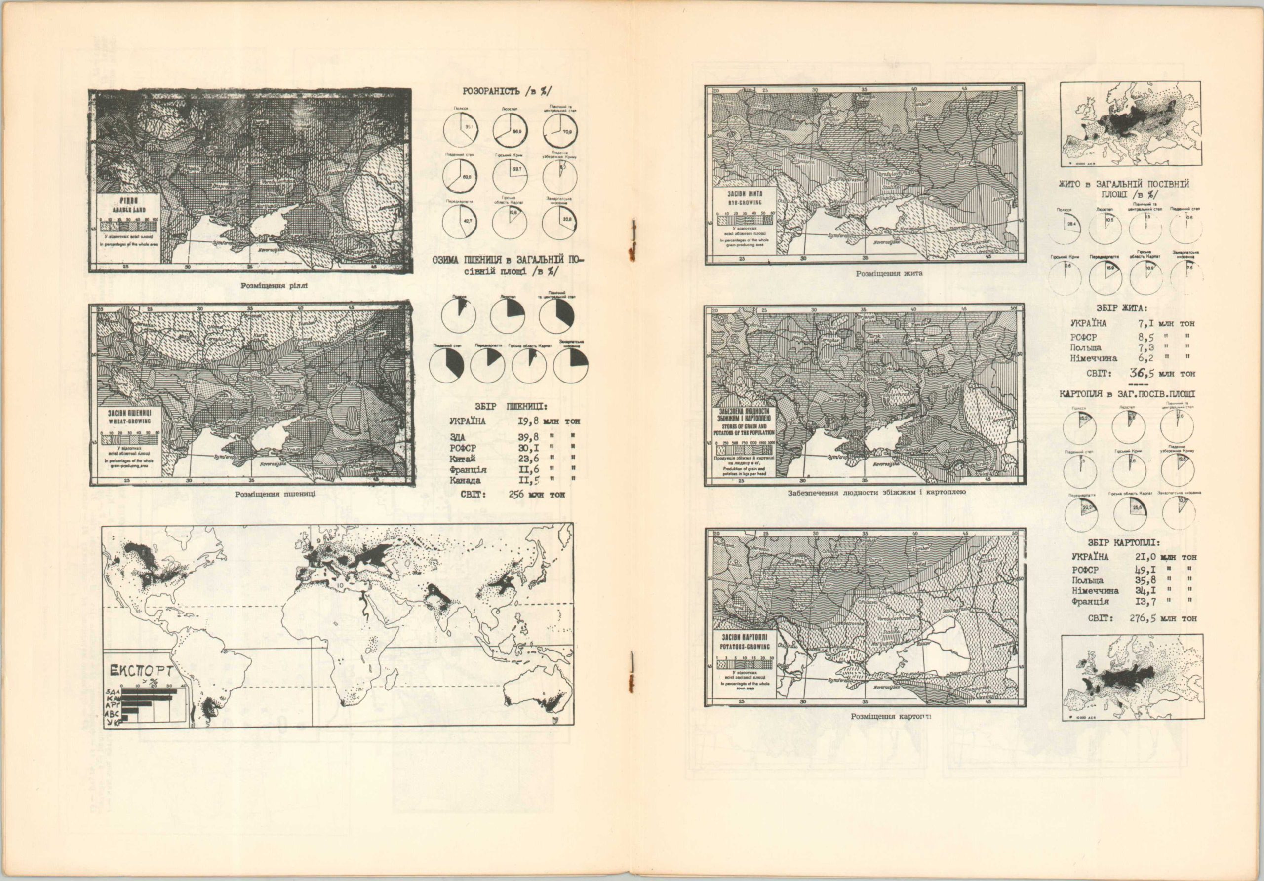 The booklet begins with statistics presenting Ukraine by the numbers, listing ethnographic groups, grain exports, and other relevant data. This is followed by a dozen pages of maps that outline the geographic extent of Ukrainian lands, geological strata, mining, agriculture, industrial production, transportation systems, and more.