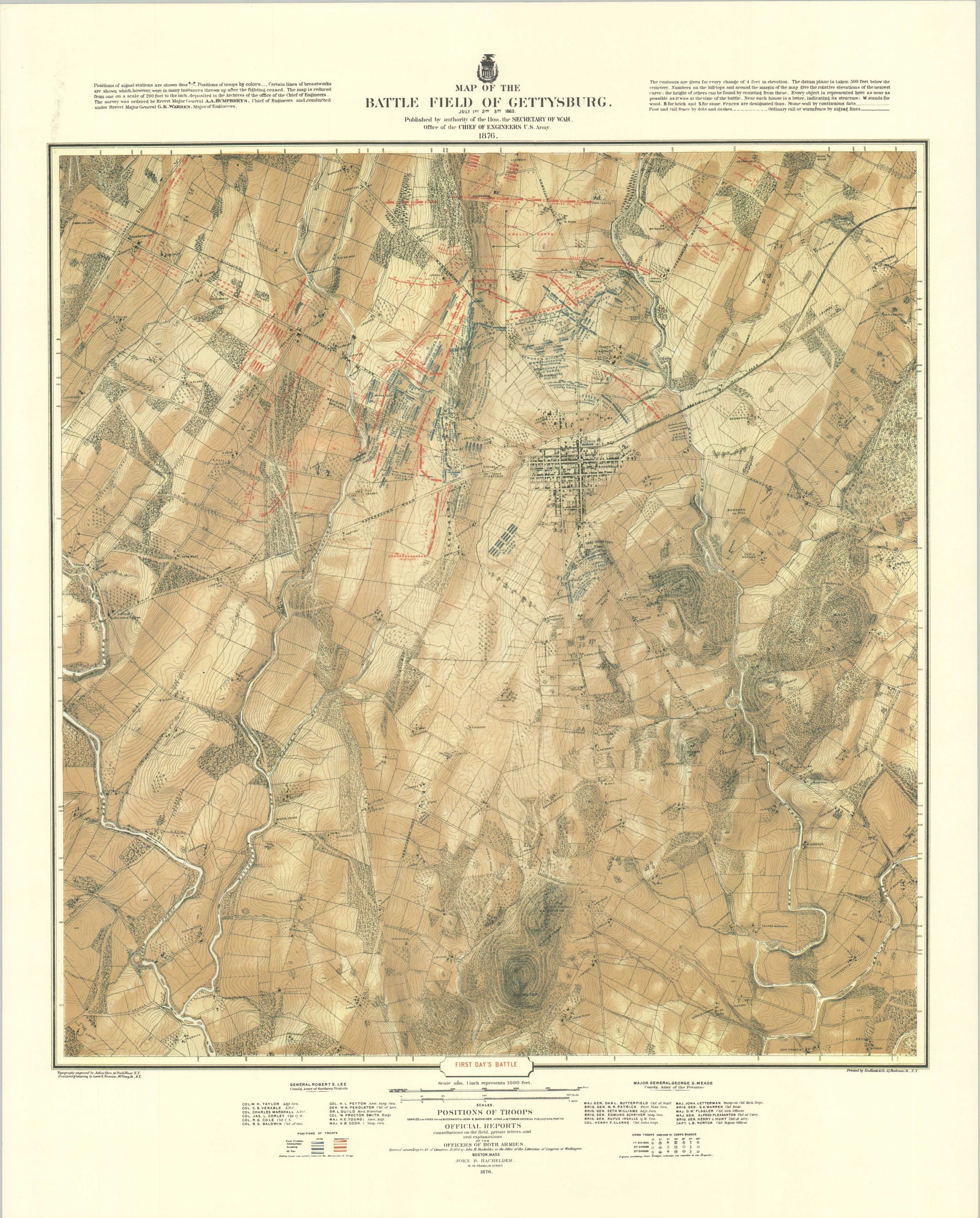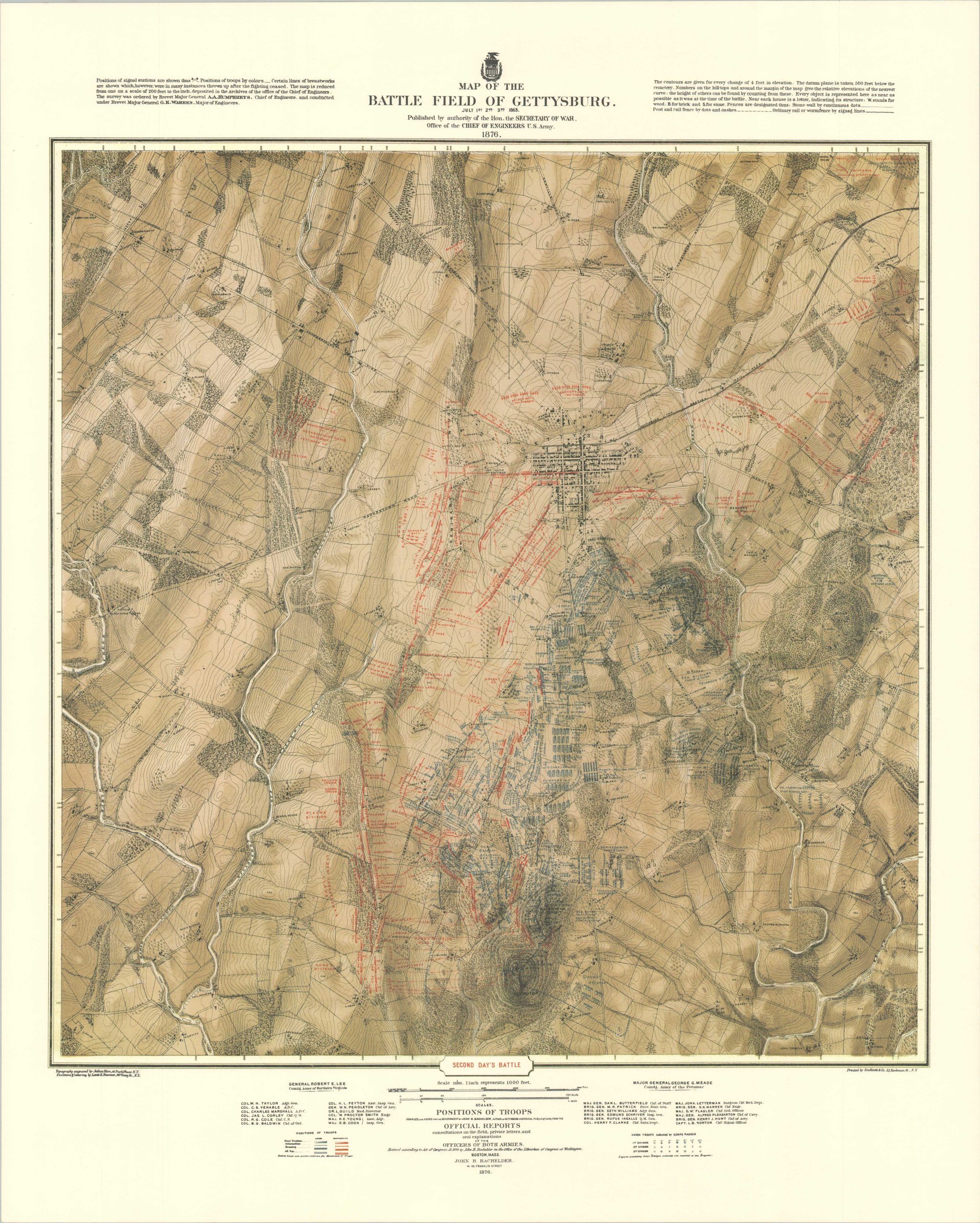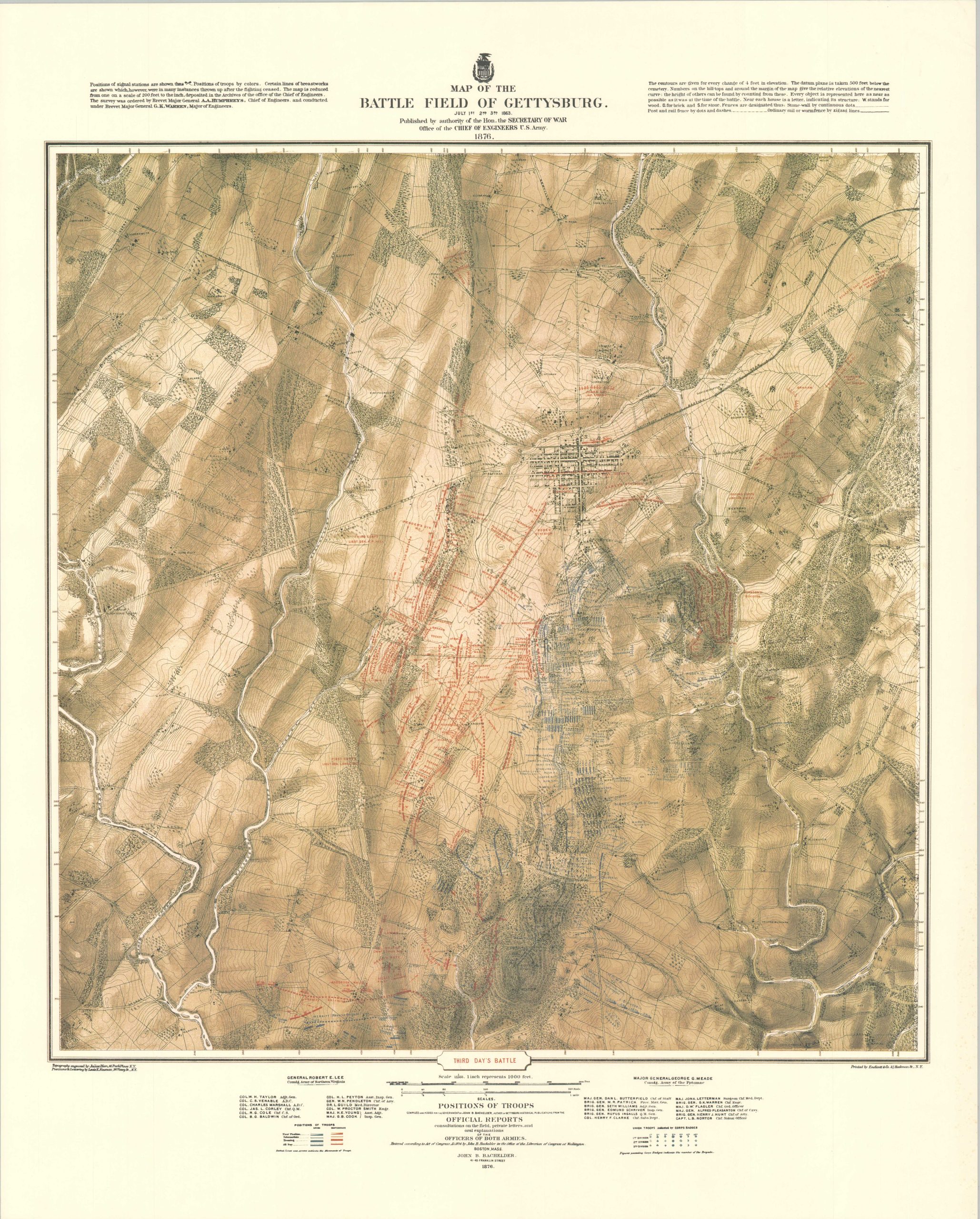 “Following European military tradition, U.S. Army Engineers published maps for most major battles shortly after the war. However, the Gettysburg after-battle maps were not published until 1876. In comparison to the others, they are quite remarkable. Their production resulted from the collaboration of a civilian, John Bachelder, and a team of Army surveyors under the direction of noted mapmaker, Gen. G. K. Warren. These topographic surveys were so detailed that the resulting maps, issued at a scale of 1 inch equals 1,000 feet, used four-foot contours and shading to represent the terrain. Three maps, rather than one, documented the positions and movements of the armies during the course of the battle.”