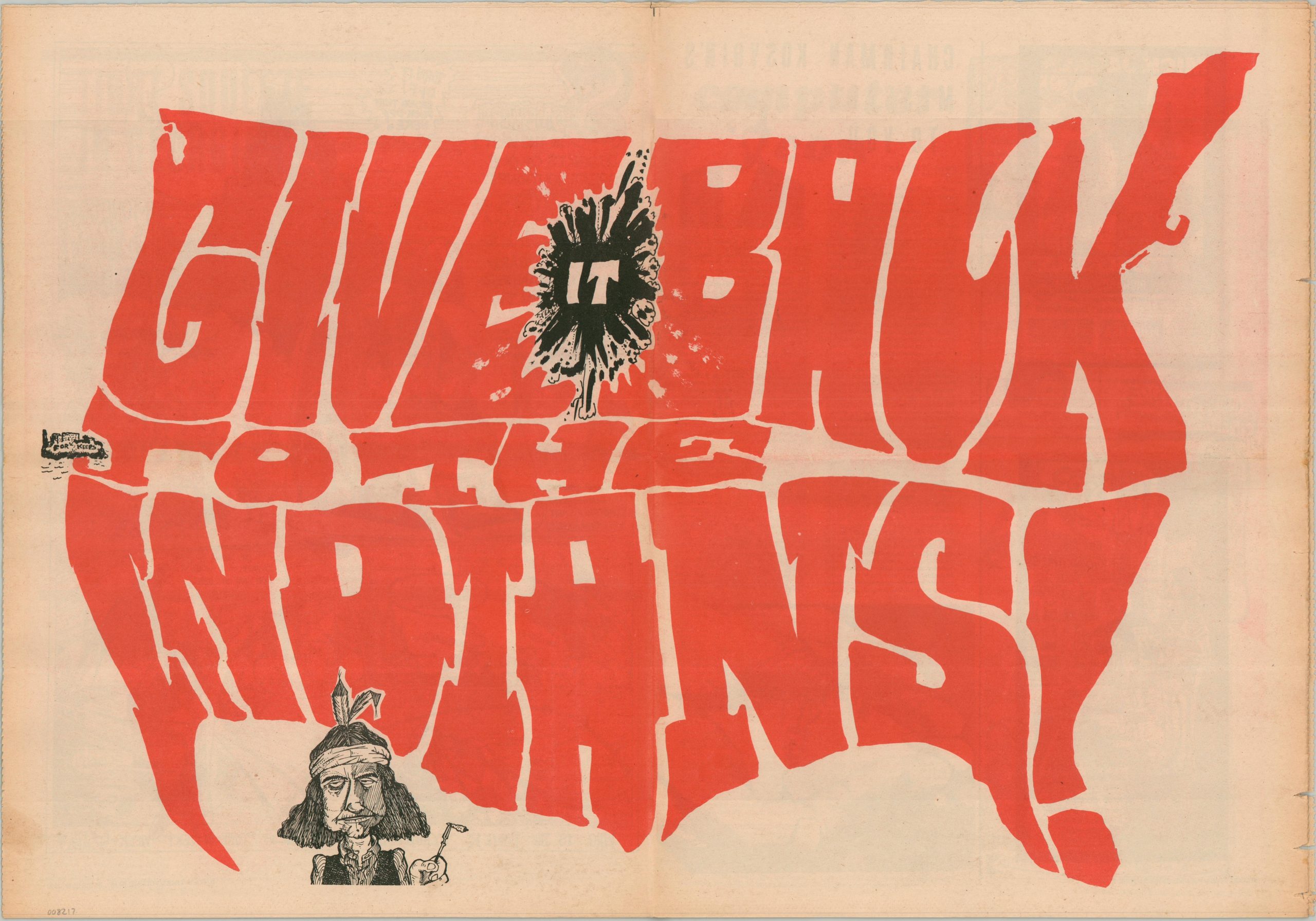 An outline of America encourages to Give It Back, presumably by returning unused federal lands via the terms of the 1868 Treaty of Fort Laramie. The ongoing Alcatraz Occupation is prominently shown, with the island labeled ‘For Keeps.’ Interestingly, the Salish Sea and Cape Cod are among the only features that are distinctly identifiable amidst the heavily stylized outline. The word ‘IT’ is contained within an oil gusher, a not-so-subtle reminder of the value of the original inhabitants’ claims. A ‘typical’ 1970s Native American, toking a roach clip, is caricatured in the lower left (appropriately, in the Southwest).