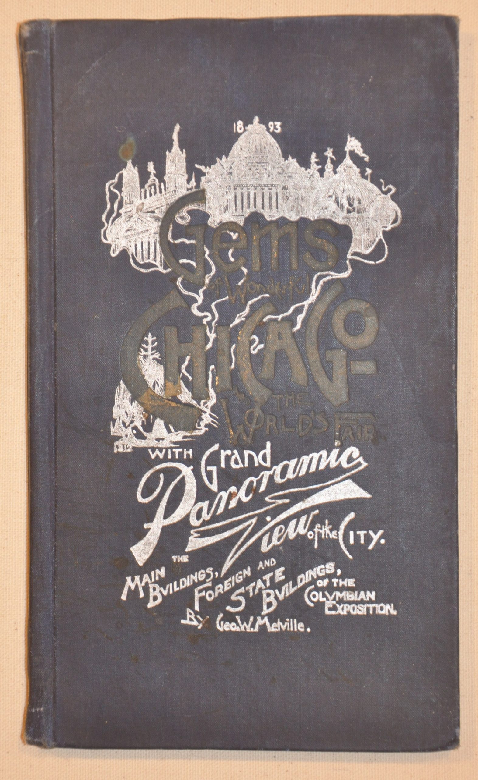 The accompanying 87-page book is bound in blue cloth and contains numerous photographs of structures at the fair and detailed descriptions of the various exhibitors. At the back of the volume is a 12″ x 12″ map of the grounds, drawn by chief draughtsman H. Heinze. Apparently, this plan was produced in haste, as it exhibits a number of errors in spelling and numbering.