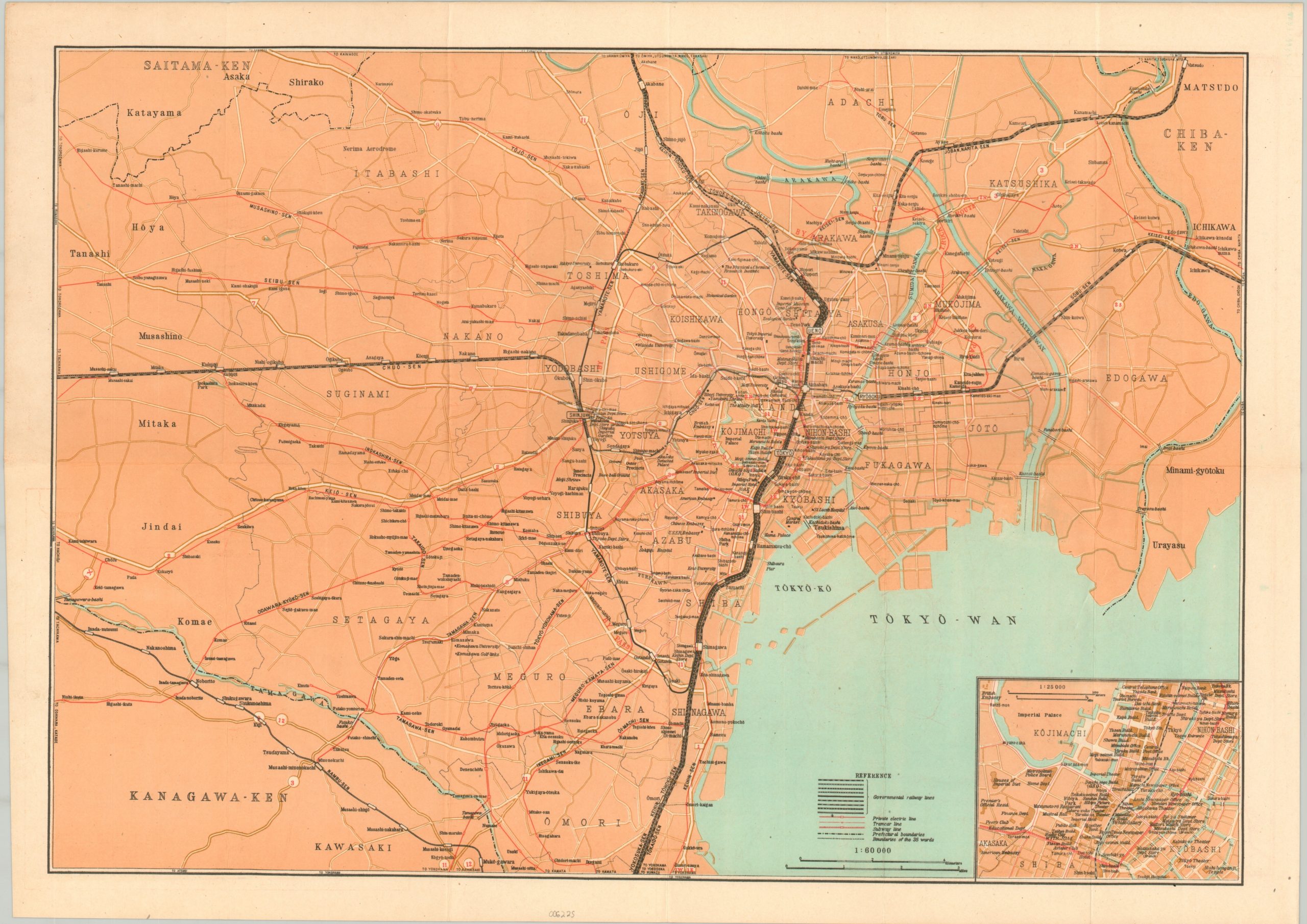 This transportation map of Tokyo, Japan and the surrounding area was published in February 1946 by Nippon Chinzu Kaisha. A Willy’s Jeep on the front cover indicates it was likely intended for use by Allied soldiers on occupation duty in the months following V-J Day. Government railway lines, tramcar, subway, and private electric lines are noted throughout the image, along with major locations of interest and ward/prefectural boundaries.