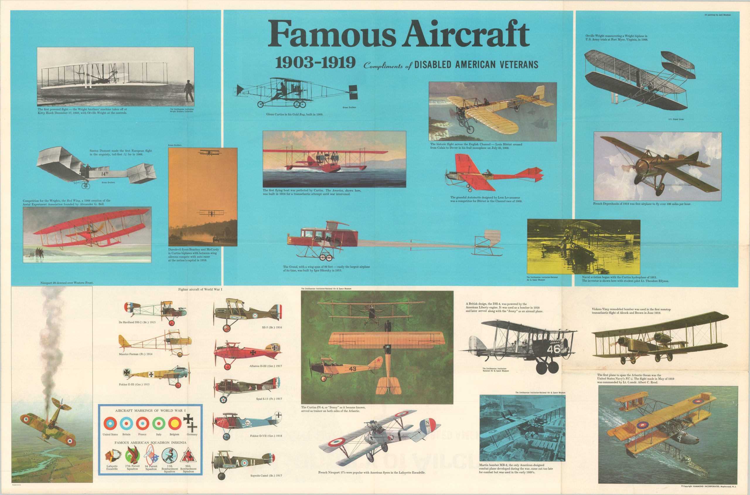 Heavy emphasis is given to aircraft of the Allied power – notably the Soviet Tupolev Tu-144 is omitted. The verso shows Famous Aircraft from 1903-1919, with special attention given to the fighters of World War I.