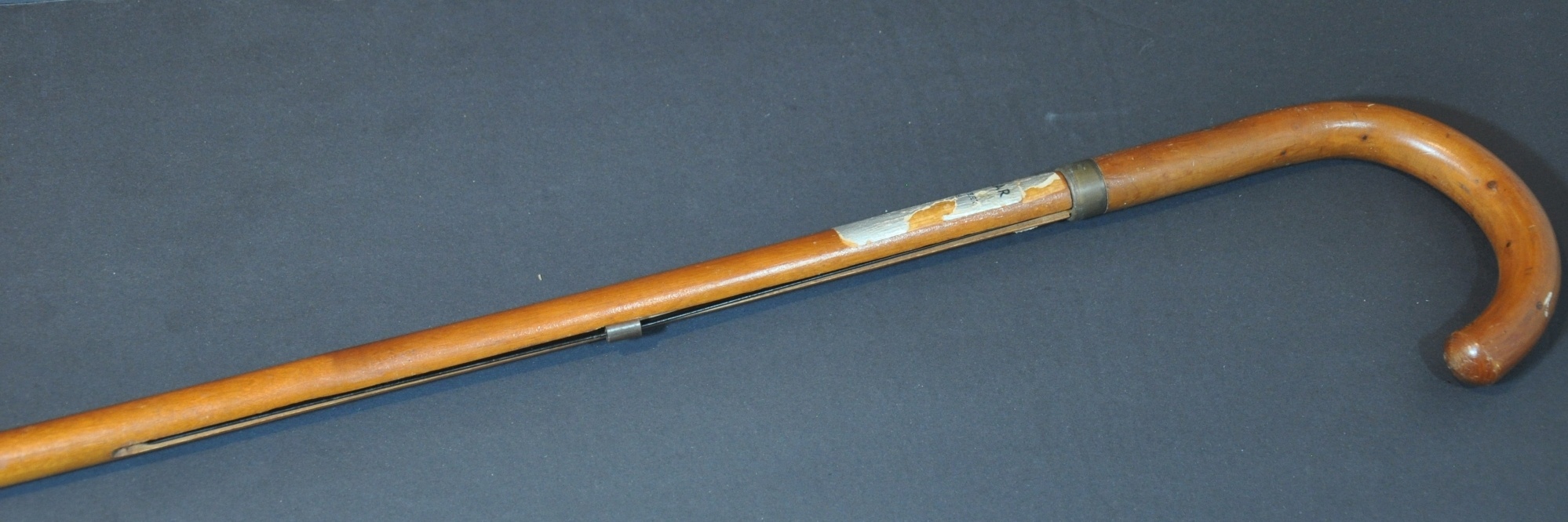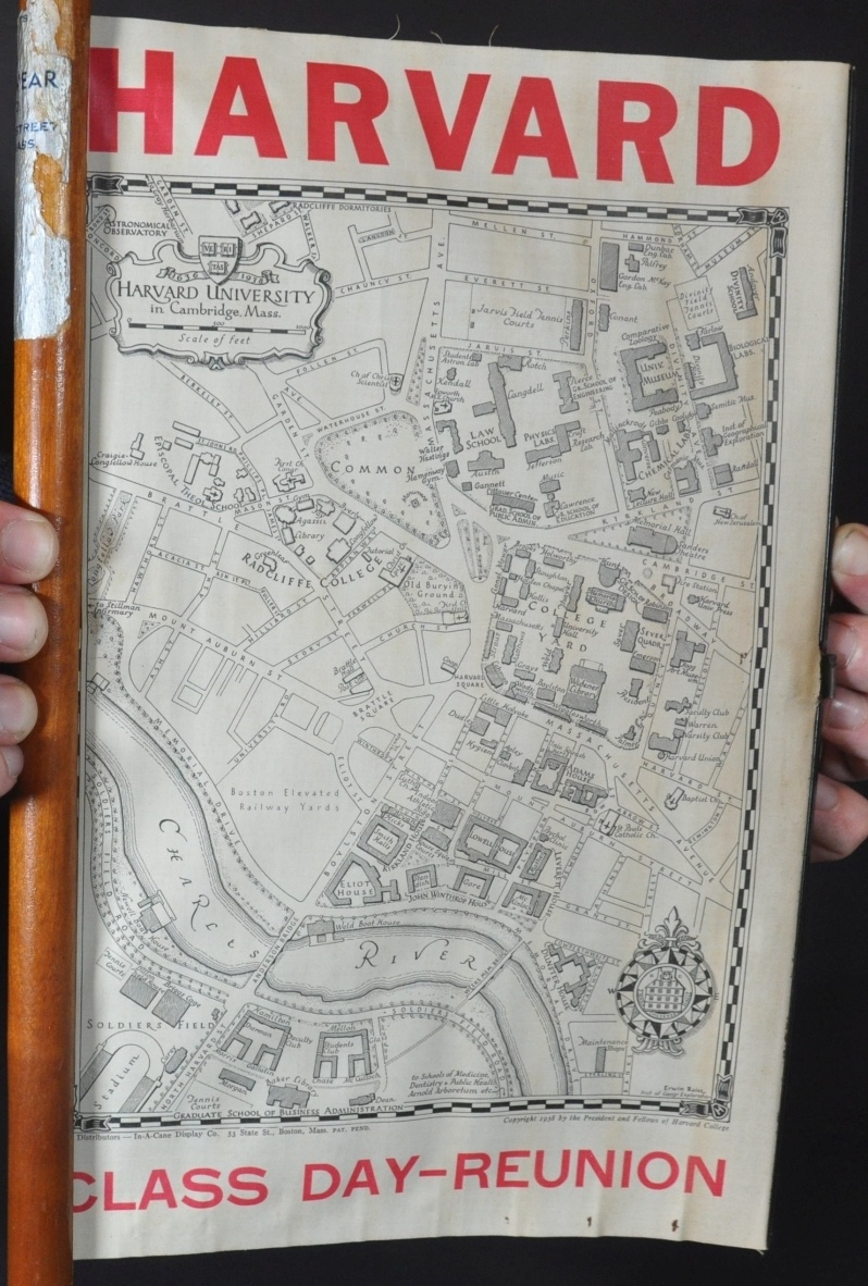 Condition Description: 9" x 13" pictorial map of Harvard's campus, printed on linen and affixed to a metal rod. Good condition, though lightly toned in horizontal strips and three small spots are in the lower right margin. The map rolls up and is embedded within a metal-tipped wooden cane approximately 35" long. A torn sticker identifies it was possibly distributed by a menswear company in Milton, Massachusetts.