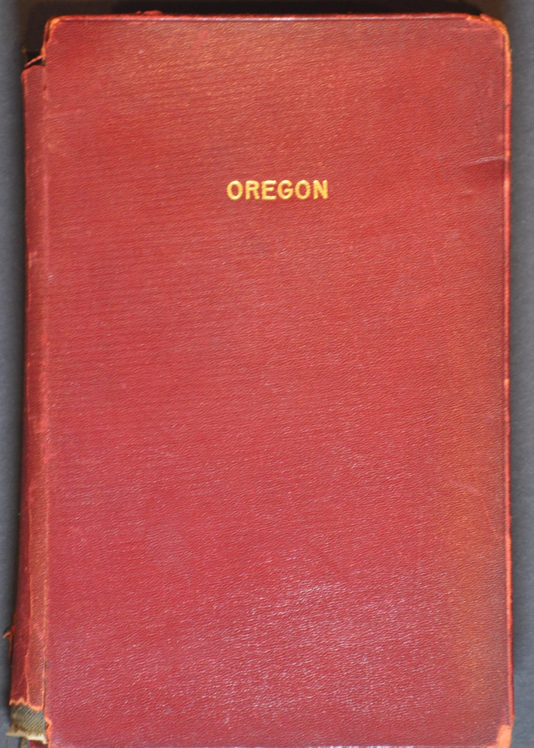 Condition Description: Large color printed map, mounted on sturdy linen and folded into old red leather covers. Handwritten updates to rail lines. Minor wear and tiny holes along the fold joints. An irregular tear, about 3", in the upper left. Scattered spots of soiling in the upper right and lower center. Based on see-thru from the verso, it appears to have been originally printed on the back of a map of Washington by the same publisher - possibly a custom composition for a road trip? Good condition overall.