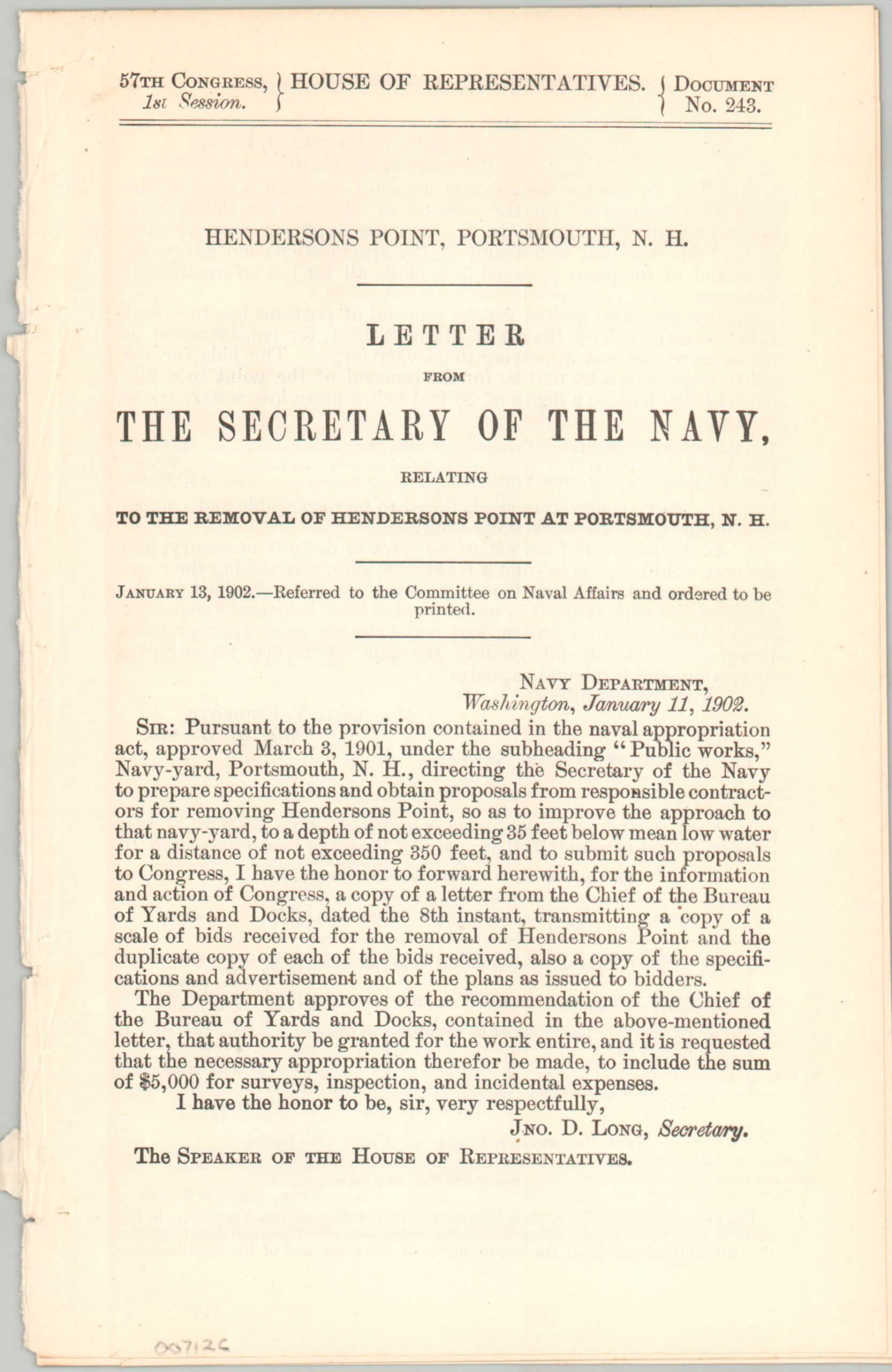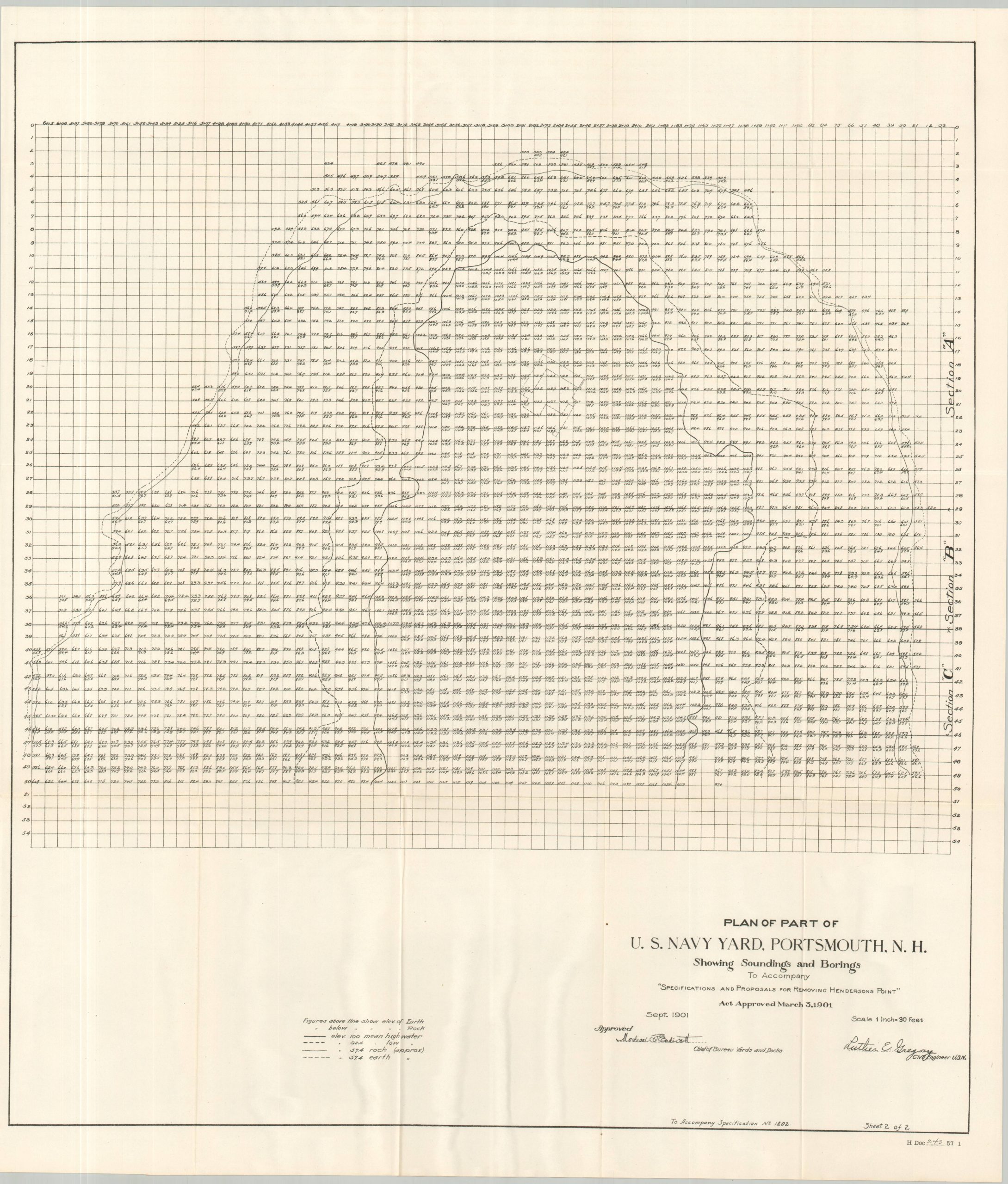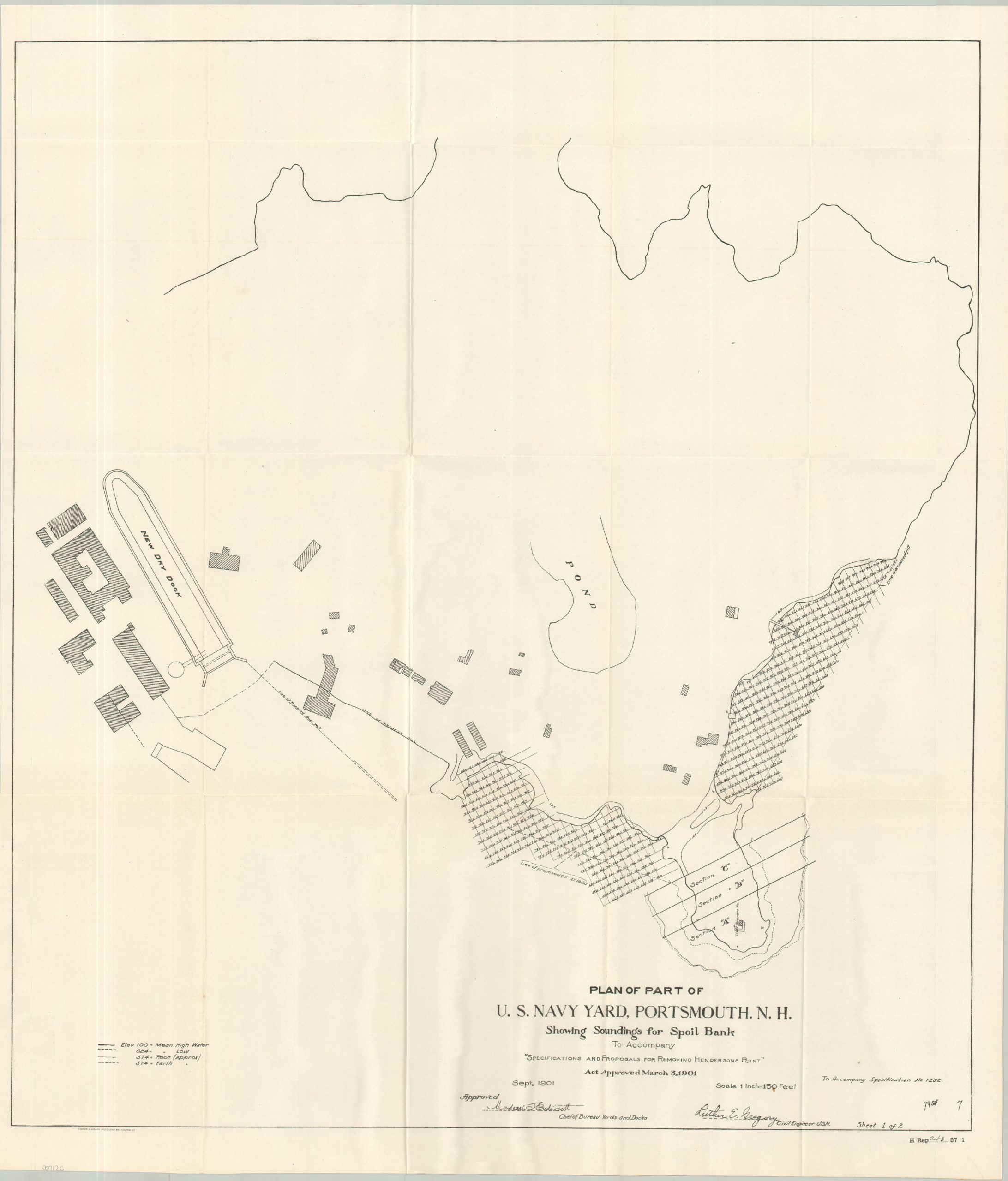 This fascinating pair of maps and accompanying report were published by the Government Printing Office in 1901 as part of a volume for Congressional review. The contents detail the work of the U.S. Navy Bureau of Yards and Docks on surveying improvements to the Portsmouth Navy Yard. Notably, Navy officers were assessing the costs required to excavate and remove Henderson’s Point through a private contractor, allowing for yard expansion and an easier approach to the drydock facilities.