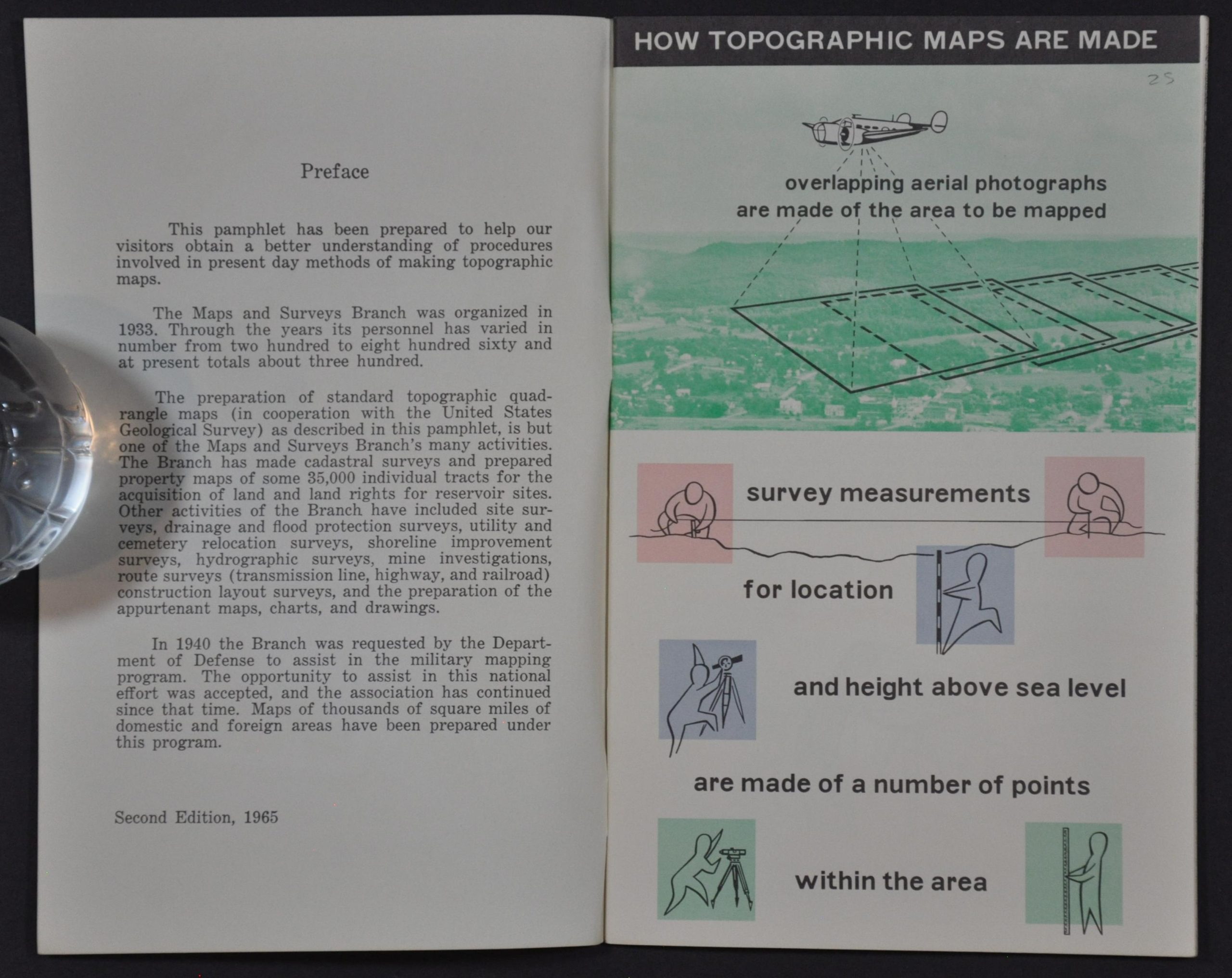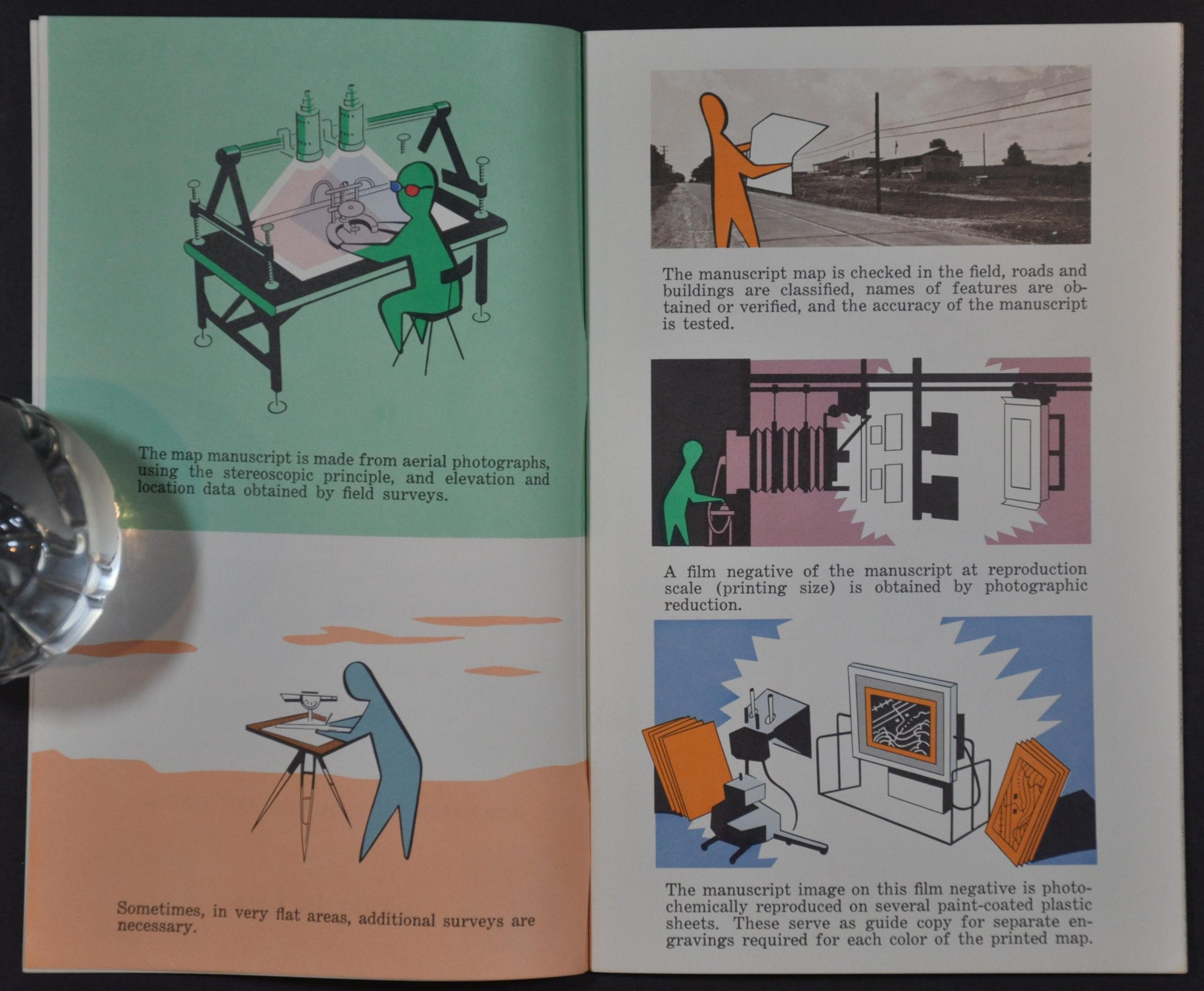 This informative booklet outlines the multi-step process used by the Tennessee Valley Authority to create lithographed topographic maps. Aerial photographs and surveys are combined into a manuscript, which is then photographed in negative. This image is then transferred to several paint-coated plastic sheets from which a proof is created. This proof goes through a final editing phase before the photo-offset plates are made for each map color. Examples for each plate/color are provided – when assembled via a multi-print process, the map is complete.