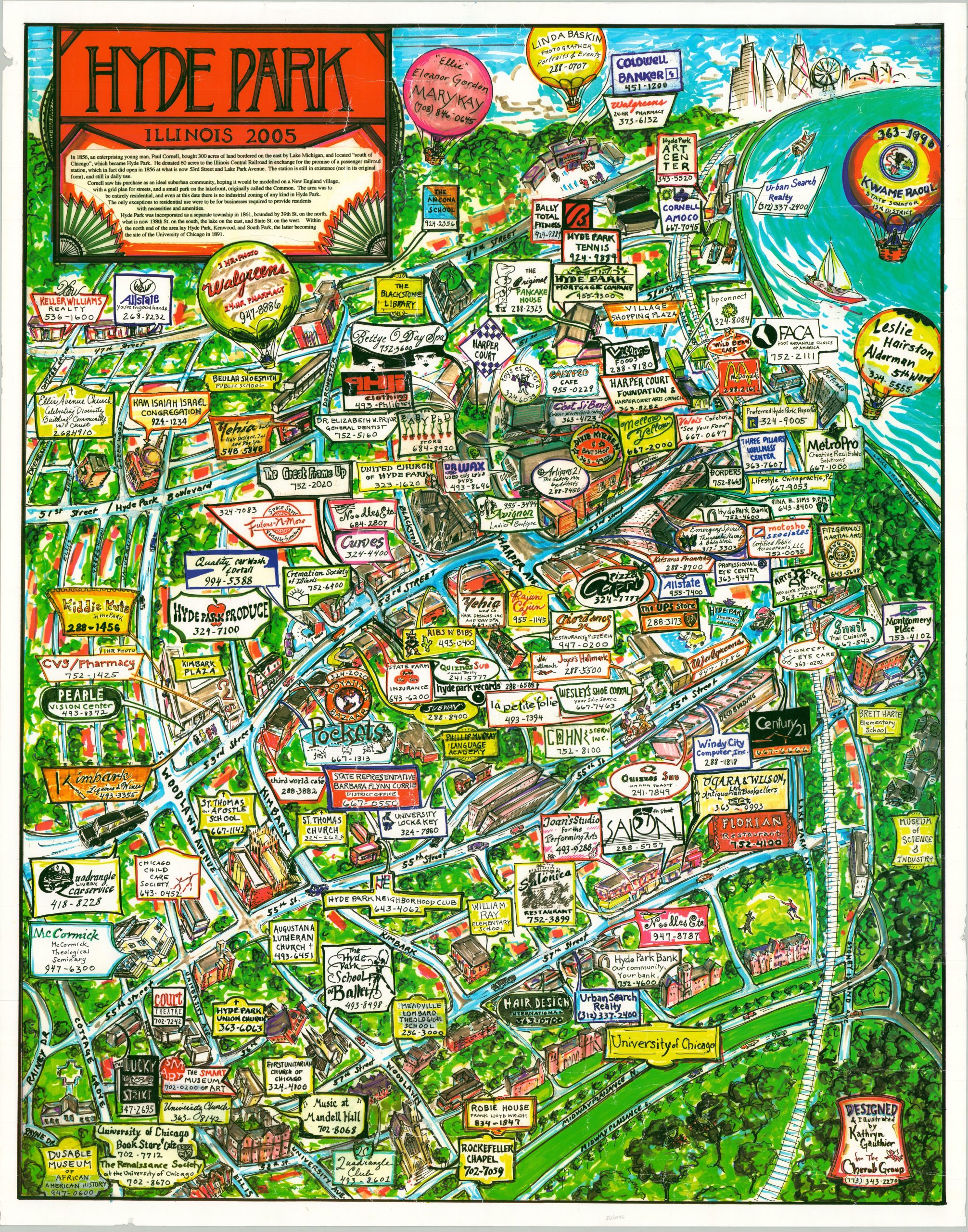 Dozens of buildings – businesses, churches, schools, etc. – are sketchily illustrated and often accompanied by large advertisements. Apart from its minimal function as a geographic reference, the map operates as a commercial directory for the region in the mid-2000s, prior to the devastating crash that completely changed the economic landscape. The Museum of Science and Industry, University of Chicago, and DuSable Museum of African American History are also prominently featured.