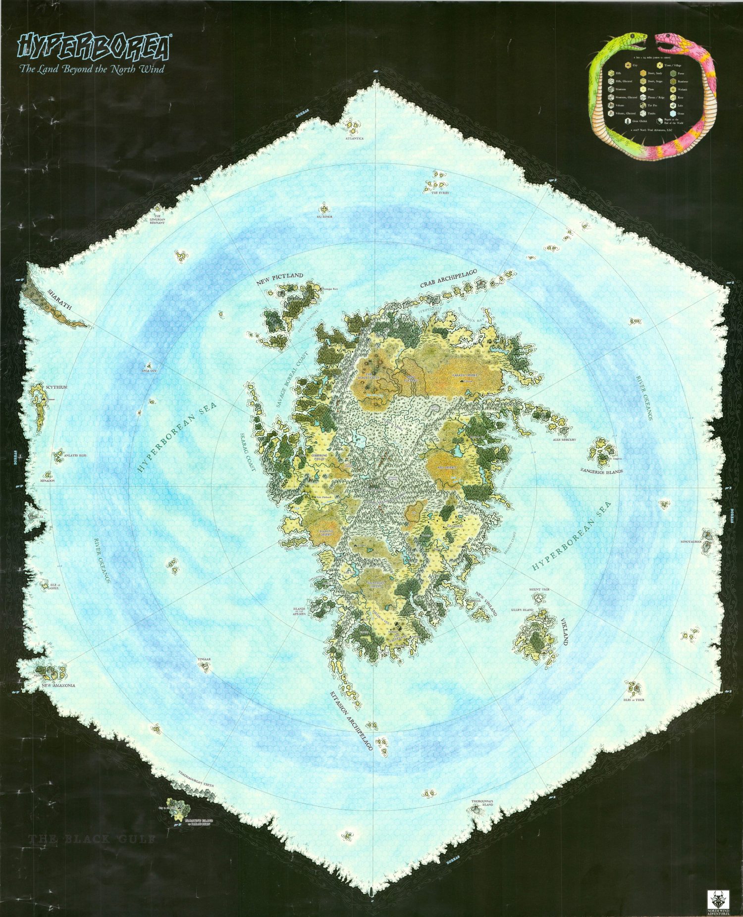 This huge wall map was issued by North Wind Adventures, LLC in 2017 to accompany their adventure role-playing game, Hyperborea (first published in 2012). The image presents a geographically diverse continent surrounded by a vast sea and numerous islands. The superimposed hex grid allows for the careful evaluation of movement across the pictorial landscape, explained further in the legend (upper right). These elements drastically affect gameplay. According to the website;