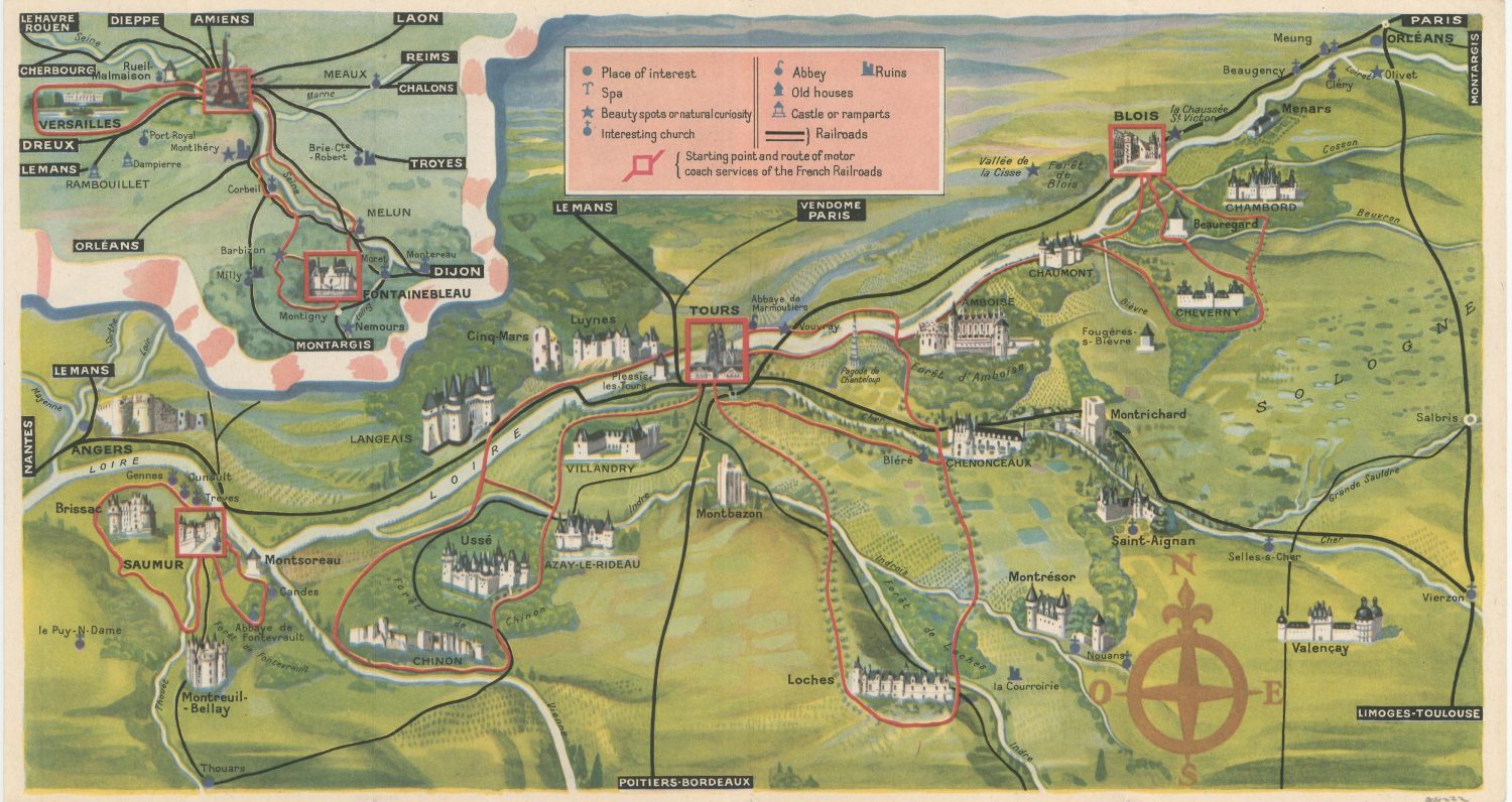 This folding pamphlet was published in the 1950s by the French National Railway to promote its routes in the Loire Valley to an American audience. The colorful map highlights motor coach tours to various chateaus and villages along the Loire between Angers and Blois, with Tours situated firmly in the center.