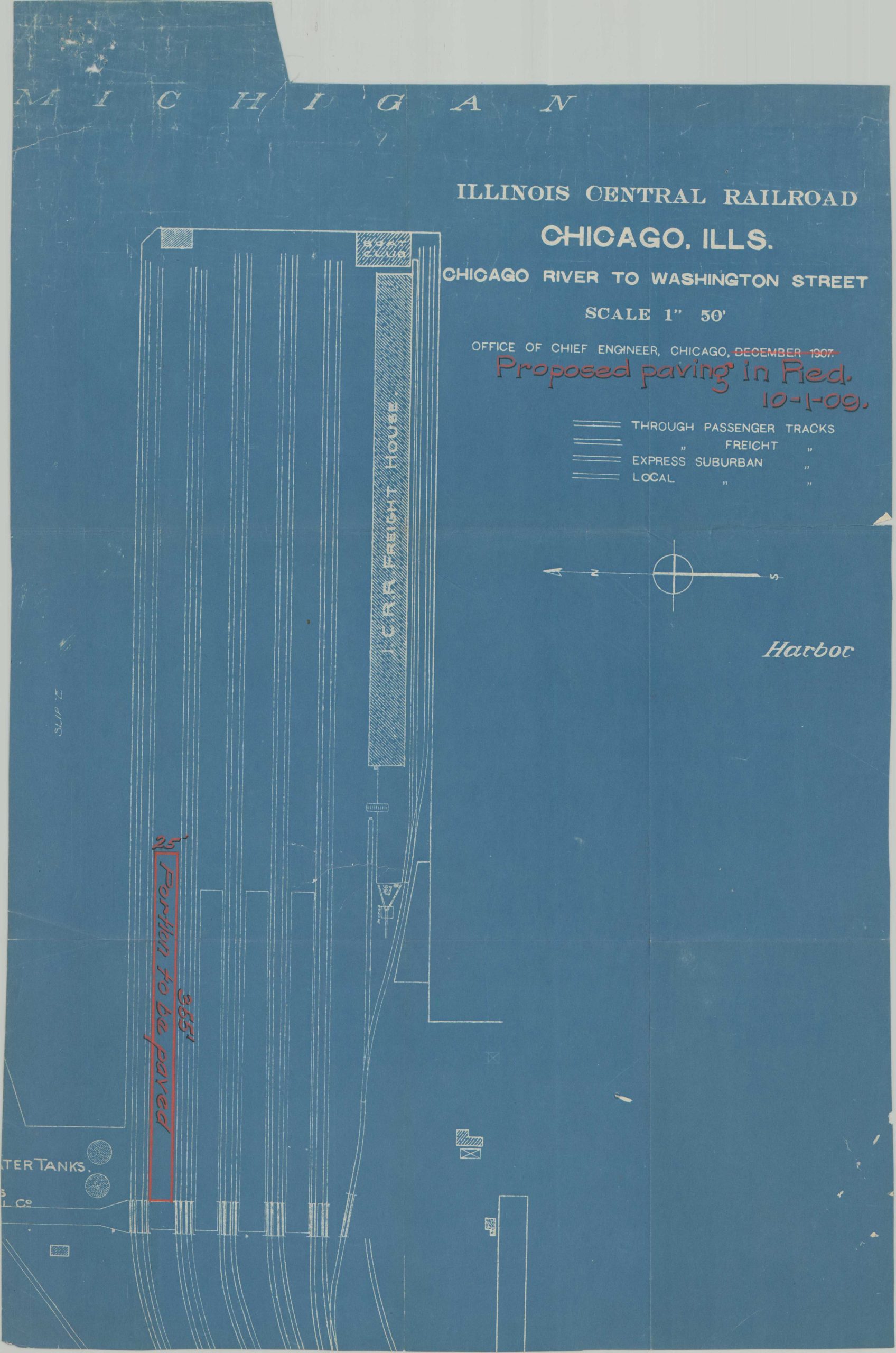 This unusual large-scale blueprint shows a portion of the tracks and a freight house of the Illinois Central Railroad, situated near the mouth of the Chicago River. Credited to the I.C. Chief Engineer, the plan is originally dated 1907 but has been updated with red ink to October 1st, 1909. A 355′ x 25′ segment of the property, adjacent to Slip E, is marked for proposed pavement.