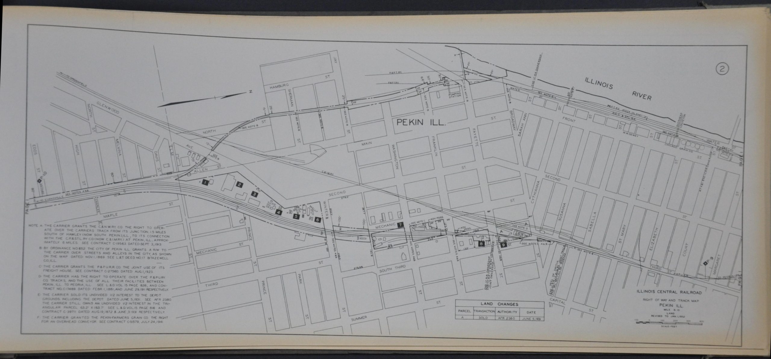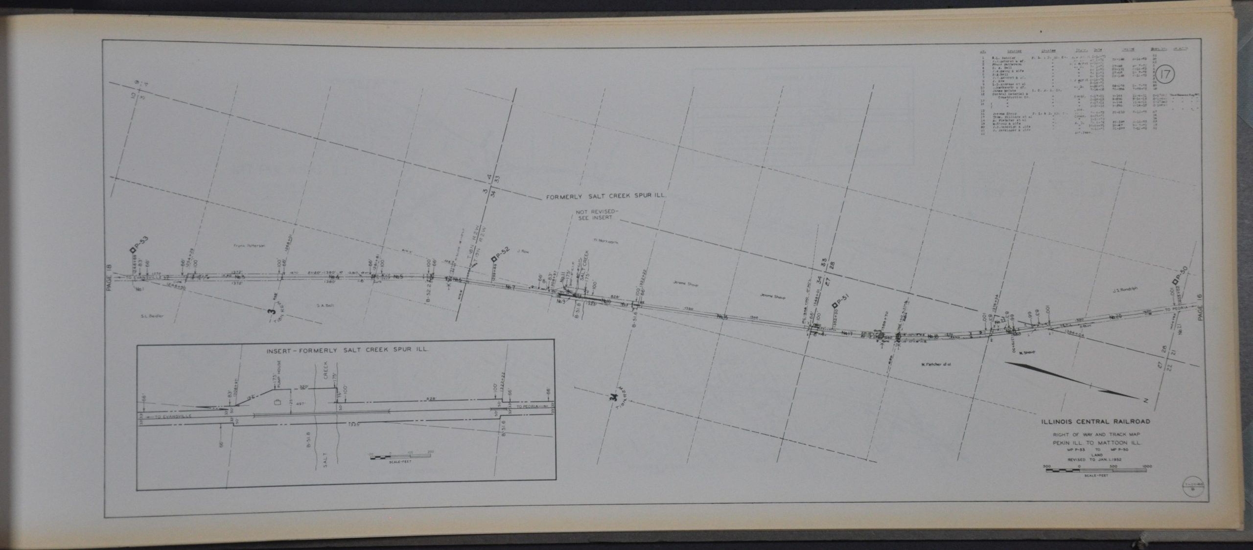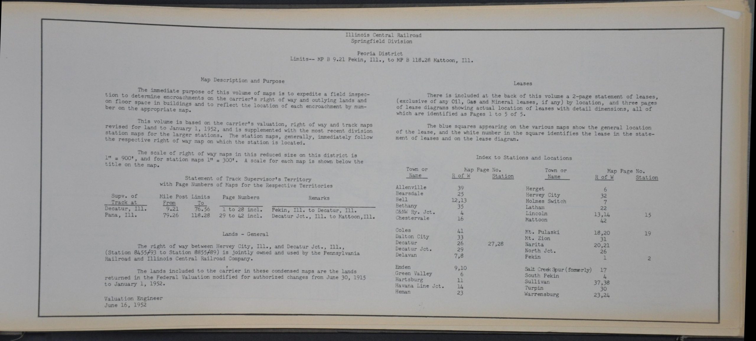 This detailed assortment of plans was compiled by engineers of the Illinois Central Railroad in June 1952. A series of forty-three maps shows the company’s right of ways and station properties between Pekin and Mattoon, Illinois – about 110 miles of track in total (part of which was also operated by the Pennsylvania RR). Both types of maps label major railroad infrastructure (switches, bridges, post markers, etc.) and are variously accompanied by tables of land changes, notes, and a compass rose.