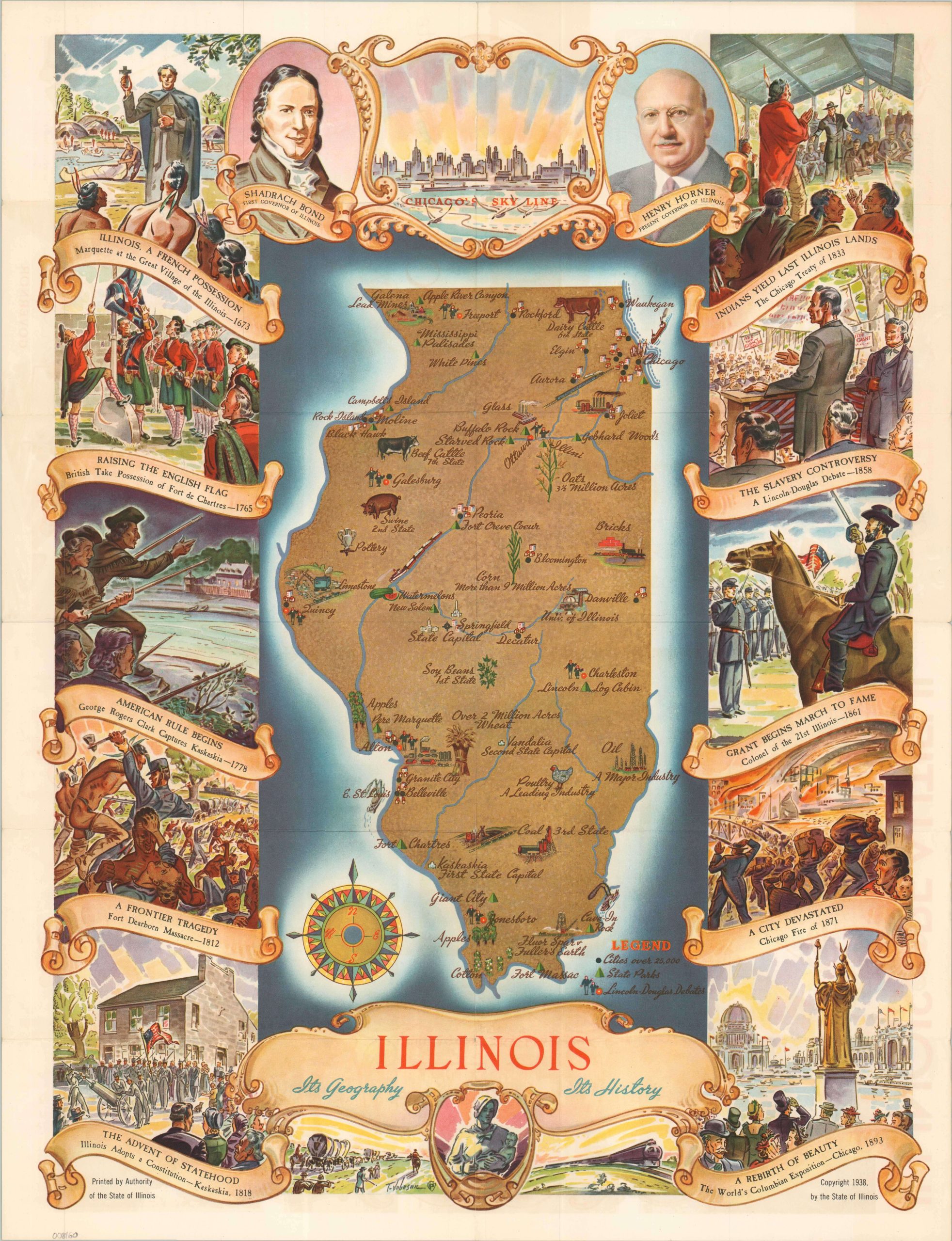 This vibrantly illustrated map of Illinois was drawn by T. Johnson (artist’s signature in the lower center) and published by the state in 1938. Scattered vignettes emphasize industrial products and agricultural exports while state parks, large cities (over 20,000), and sites of the Lincoln-Douglas debates are identified according to the legend in the lower right. The map is bordered by ten scenes of important historic events across the state’s history, ranging from Marquette’s arrival in 1673 to the Columbian Exposition of 1893. Portraits of Shadrach Bond and Henry Horner, the first and present governors of Illinois, flank a simple view of the Chicago skyline at the top of the page. A neat commemoration of Illinois as the state struggled to shake off the woes of the Great Depression.