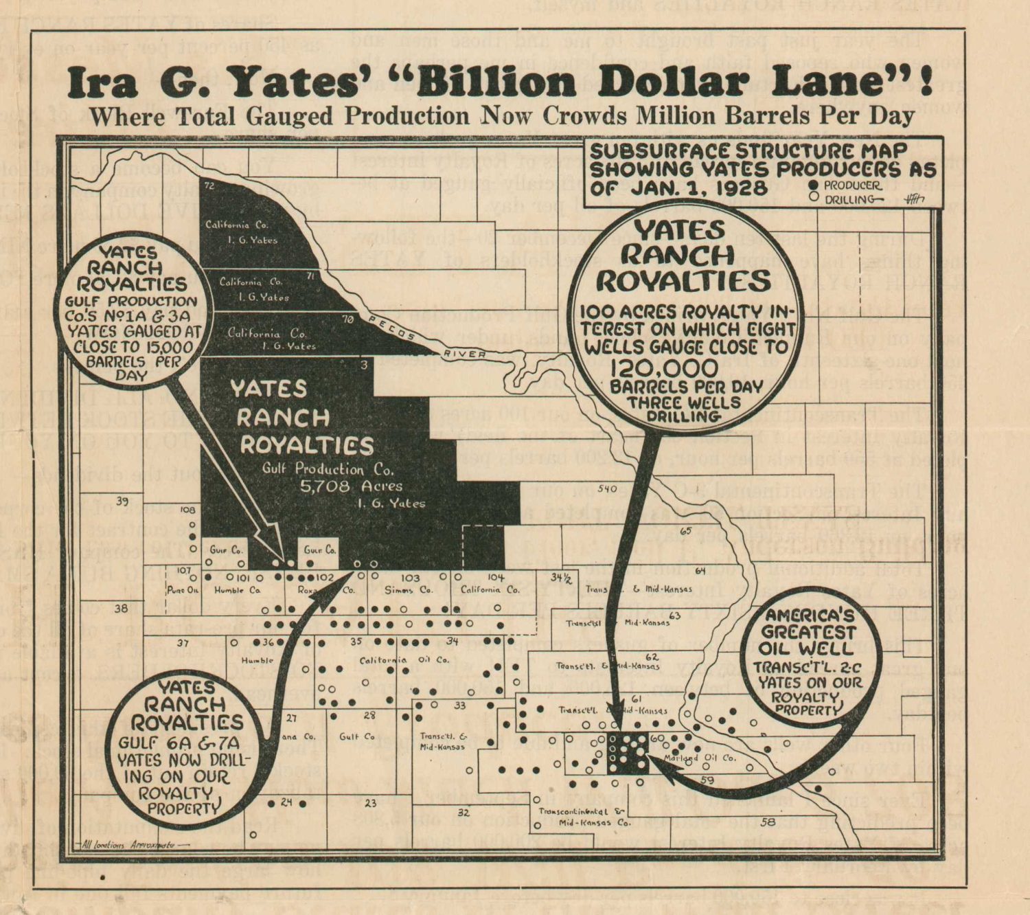 A map of Ira G. Yates’ “Billion Dollar Lane” emphasizes the plentiful production in the region. Property in black is ostensibly subject to profit by way of the Yates Ranch Royalties, though it contains few wells when compared to the adjacent parcels. The grandiose presentation falls a little flat upon closer examination. The company only controlled 1/16th of Yates’ royalties on less than six thousand acres total.