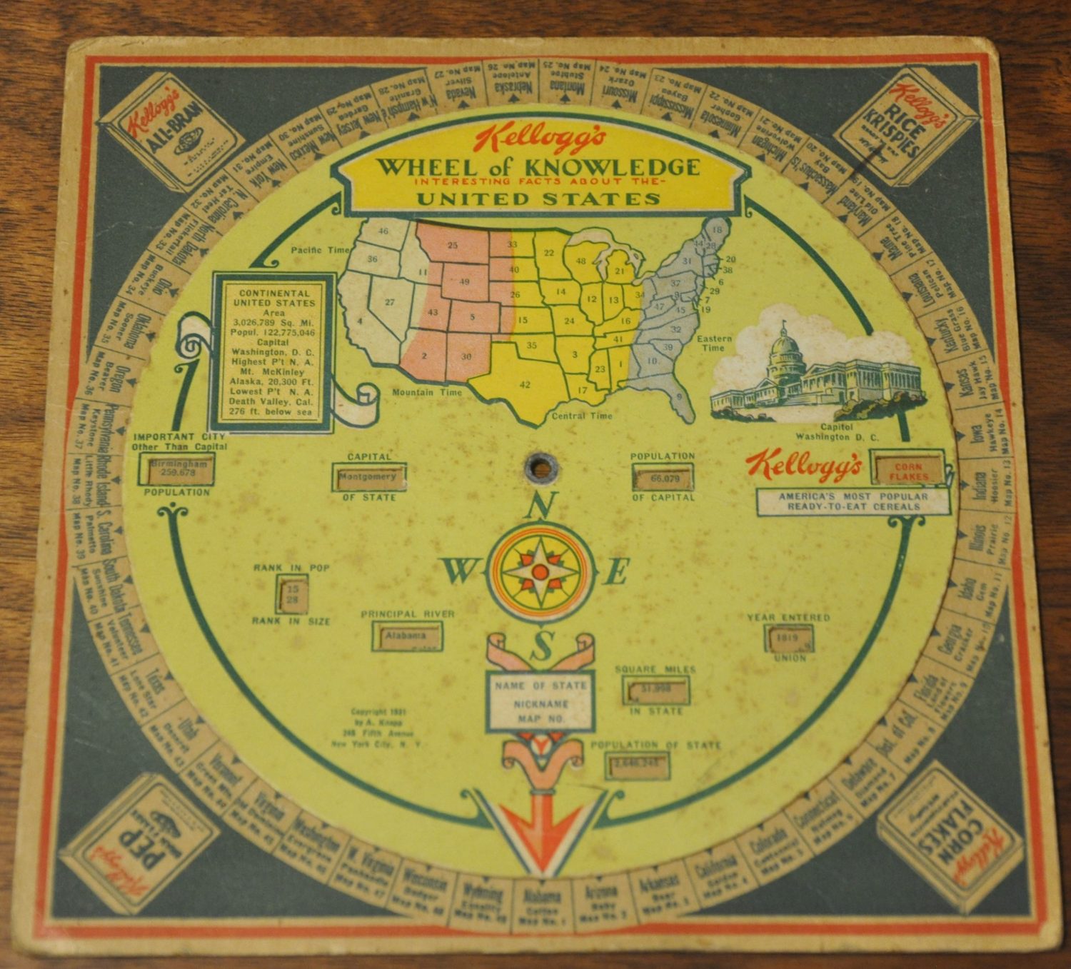 Two box tops sent to the headquarters in Battle Creek would result in the delivery of this chart, whose center wheel rotates and points to each state located along the border. As the wheel rotates, information presented in each window (population, principal river, square miles, capital, etc.) changes to reflect each state, which are numbered according to the inset map.