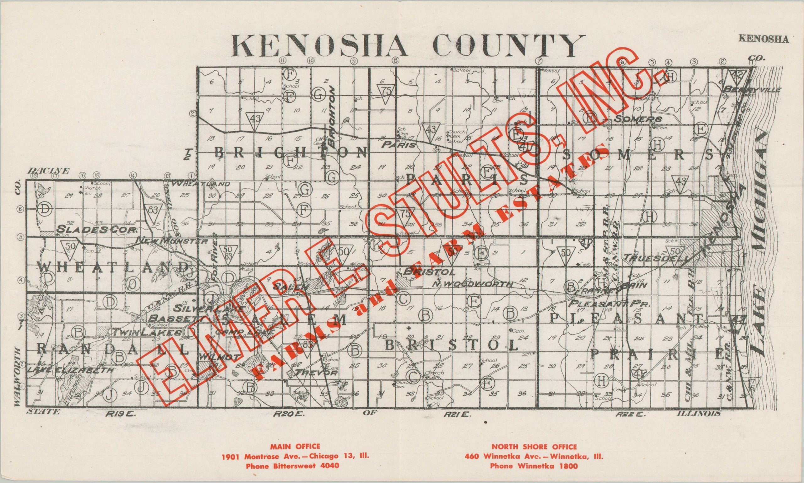This uncommon map of Kenosha County, Wisconsin was originally published anonymously, probably in the mid-1930s, and possibly by a county highway department, based on the content presented. Red overprinting indicates this example was distributed by the real estate firm of Elmer E. Stults, Inc., with offices in Chicago and Winnetka (a northern suburb).