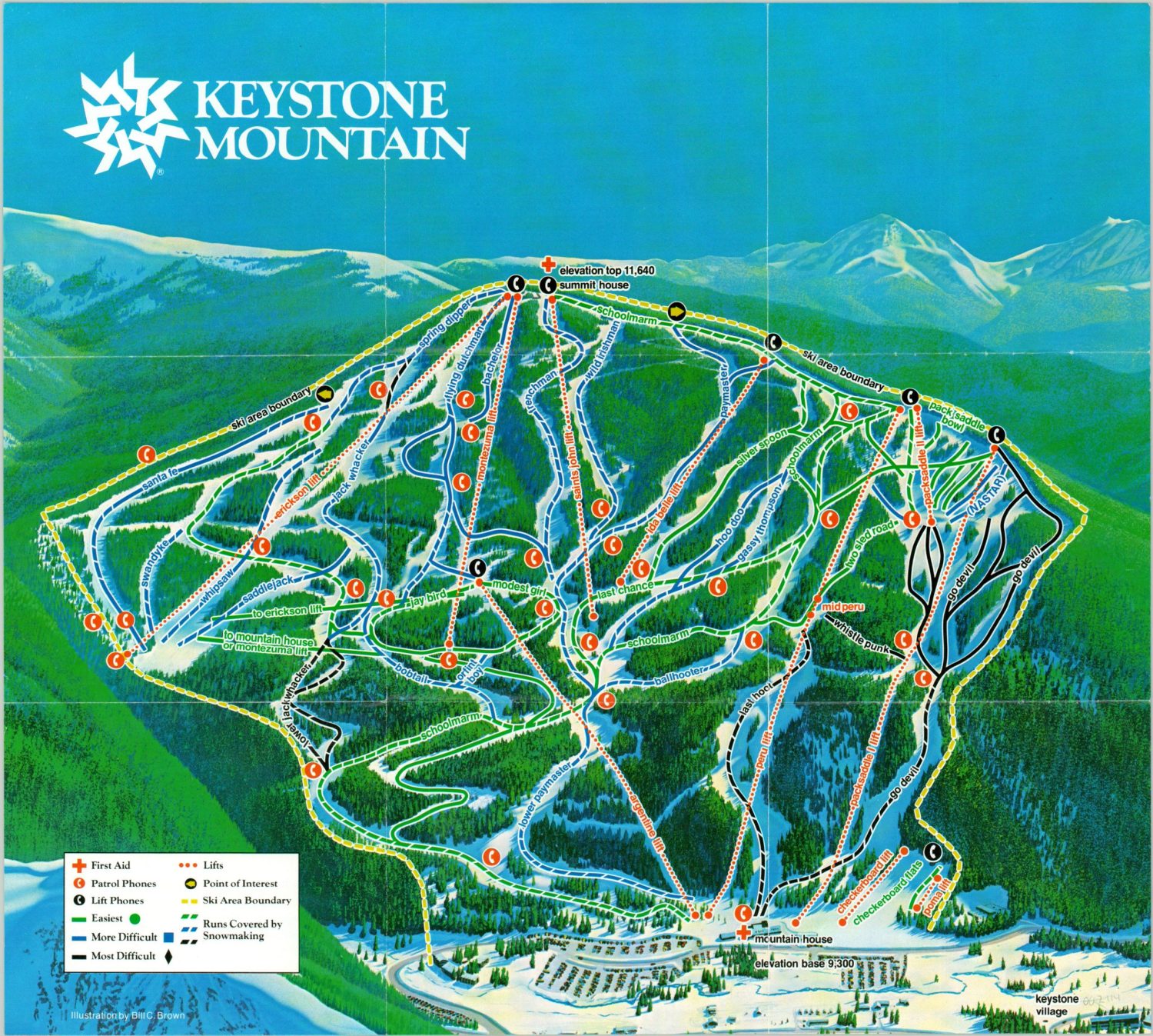 Keystone Mountain started as the dreams of husband and wife Max and Edna Dercum, with the opening season in 1970. This trail map was issued for the 1982/1983 season, the year before the North Peak opened. Today, the resort encompasses four peaks and is owned and operated by Vail Resorts.