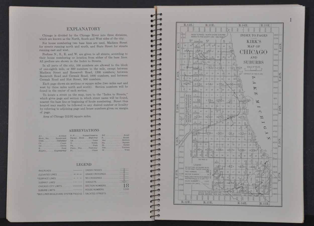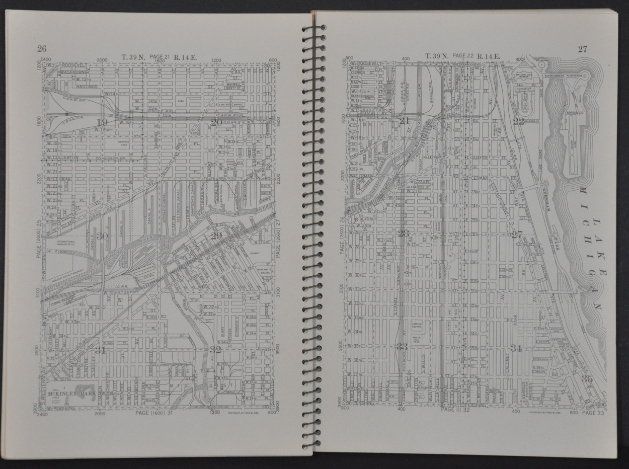 Fred Kirk issued at least thirteen different editions of his ‘Map of Chicago and Suburbs’ (really more of an atlas), beginning in 1917. This example dates from 1953 and shows a detailed street grid of much of Cook County, spread across 62 pages.