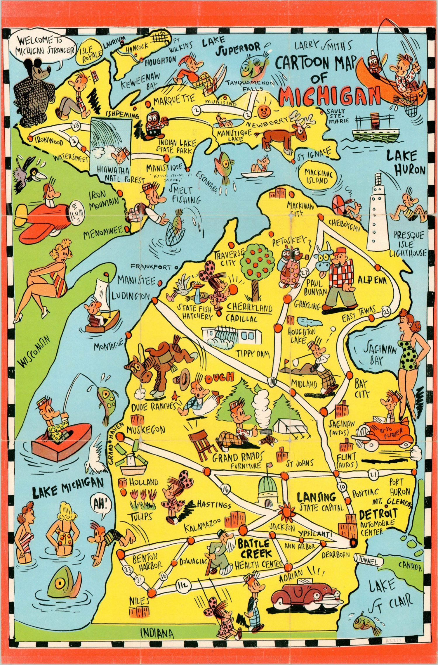 This charming vintage illustrated map of Michigan and it’s Upper Peninsula was drawn in the late 1930’s by the renowned cartoonist Larry Smith. Perhaps better known as ‘Hillbilly’ Smith, Larry traveled across the country during the Great Depression, creating cartoons for everything from postcards to baseball programs.