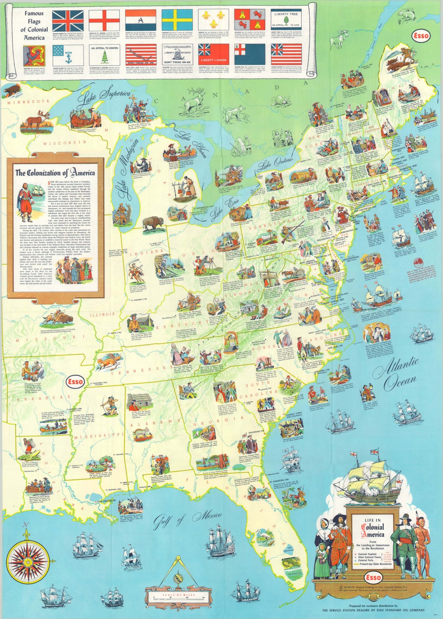 The “Jamestown Festival” took place over an eighth month period in Virginia during 1957, to celebrate the 350th anniversary of the settlement’s founding. This pictorial map was issued to commemorate the event and provides a historical overview of life in colonial America between the original landing at Jamestown and the Revolution.