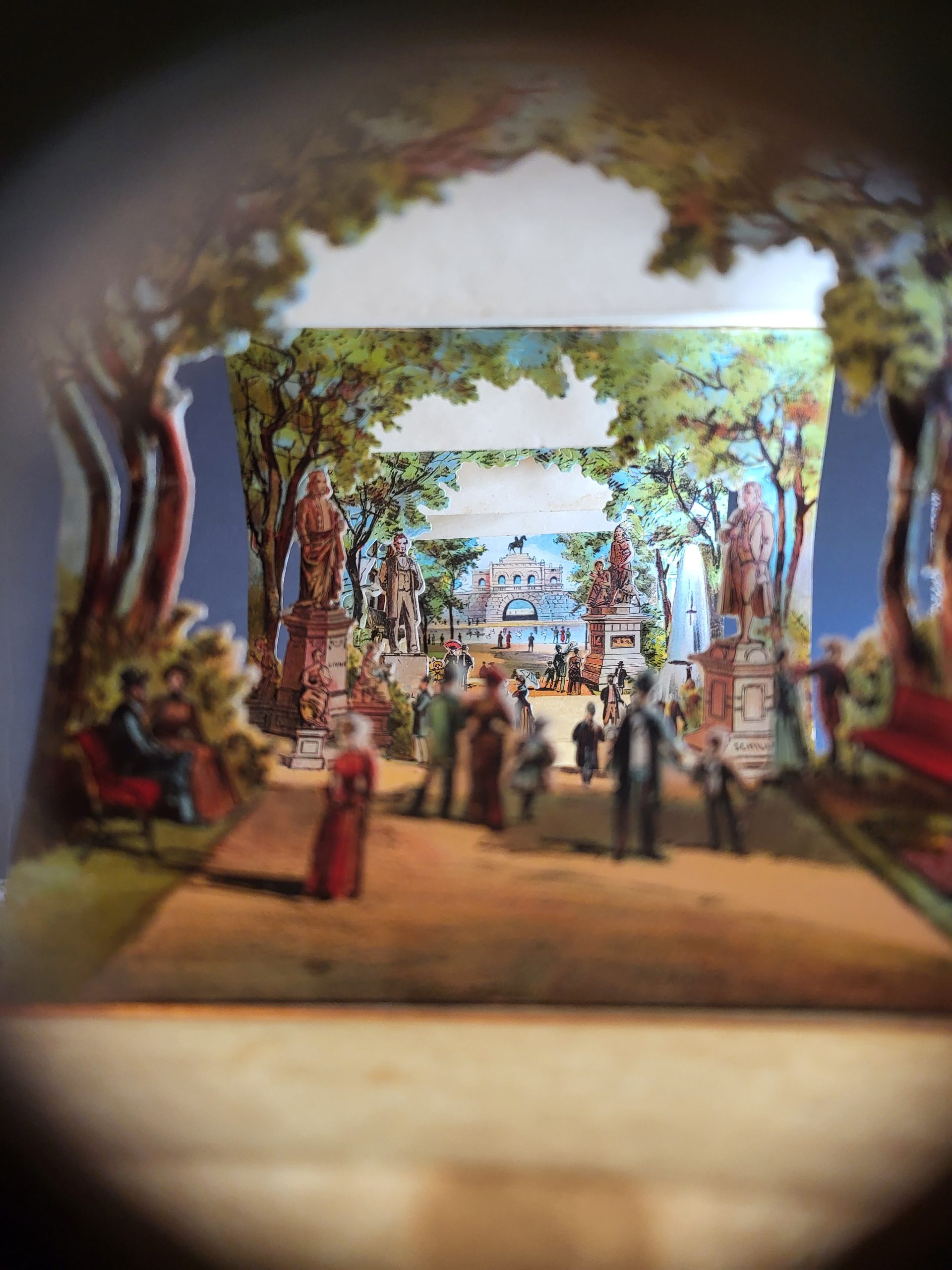 Though sold inexpensively and appealing to a mass (albeit upper-middle class) market, the ephemeral piece is apparently a scarce survivor. It is listed only once in WorldCat, at the Victoria and Albert Museum. This is the only other example of Philstrom’s work I can find online, though he produced a similar and unrecorded peephole book (copyrighted the same year) titled ‘Christ Before Pilate.’