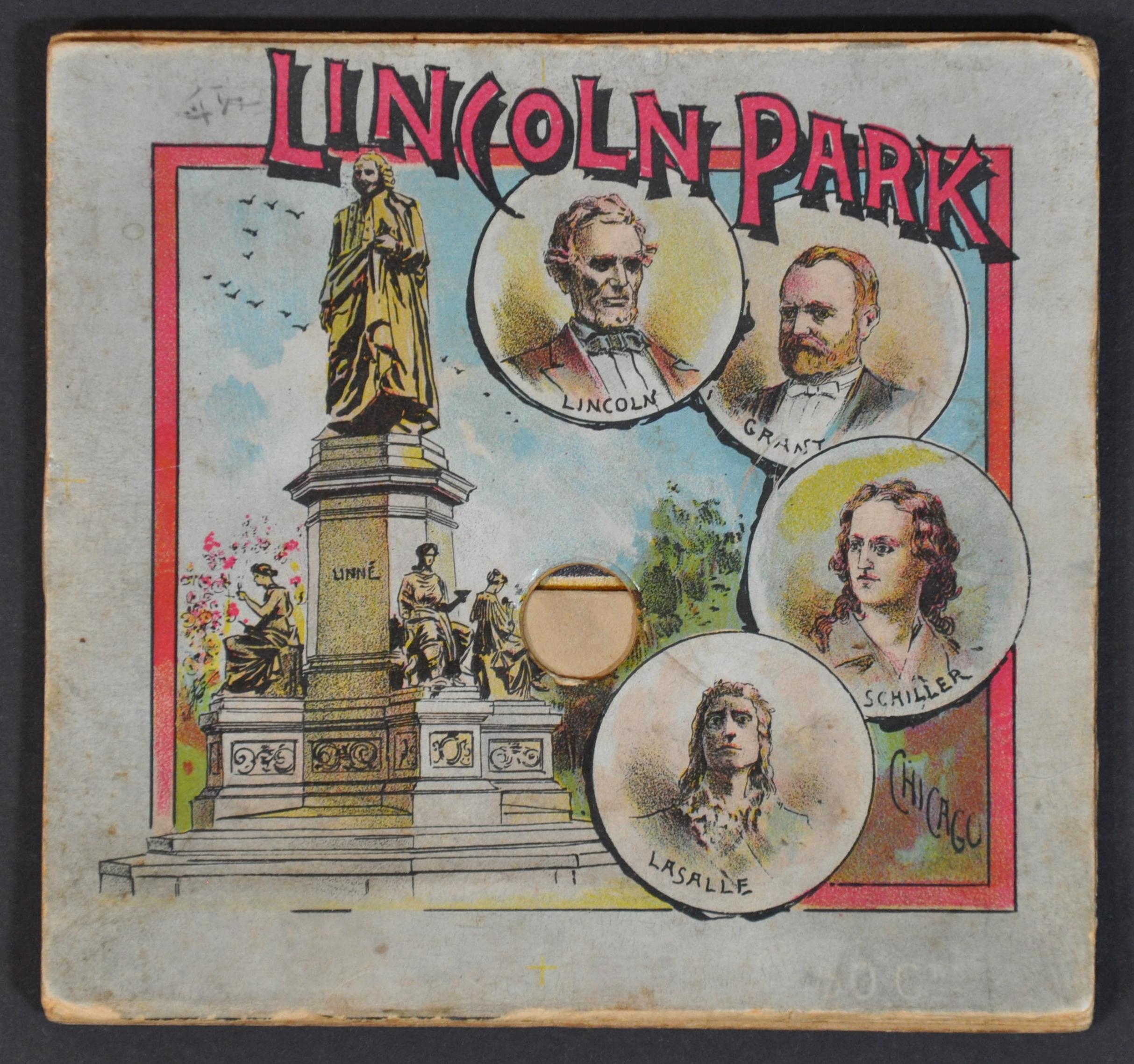 The idyllic experience is surrounded by greenery and filled with well-dressed visitors enjoying a fine, sunny day. Statues celebrating Abraham Lincoln, Joseph Schiller, Carl von Lenne, and the Ottawa Nation adorn each side of the path, which culminates with the majestic Ulysses S. Grant Monument. The monument and most of the depicted statues were not yet finished by the copyright year, hinting at a somewhat later date of publication. Abraham Lincoln: The Man was installed in 1887, perhaps prompting Philstrom to trademark his whimsical idea. However, the statue of Robert Cavelier de La Salle seen on the back cover was not completed until 1889, with the Grant Monument and Linne statue to follow in 1891.