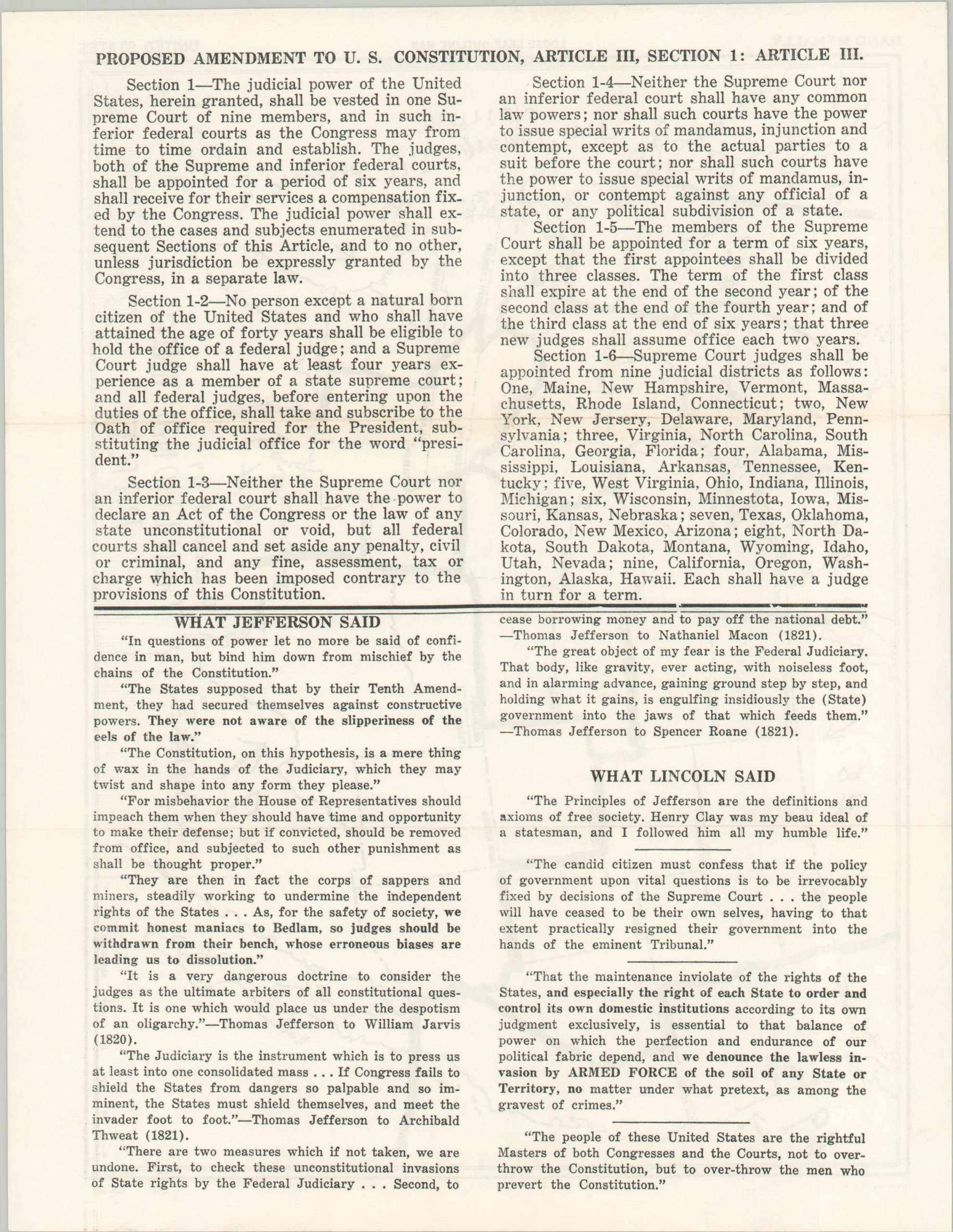 This rare and ephemeral circular was distributed by the National Whig Party in the early 1960s to encourage popular support for a proposed amendment to the United States Constitution. The text of this amendment, which can be found on the verso, outlines a nine-member Supreme Court, each appointed for six-year terms from regionally-defined districts across the continental U.S. (Hawaii and Alaska are in District 9).