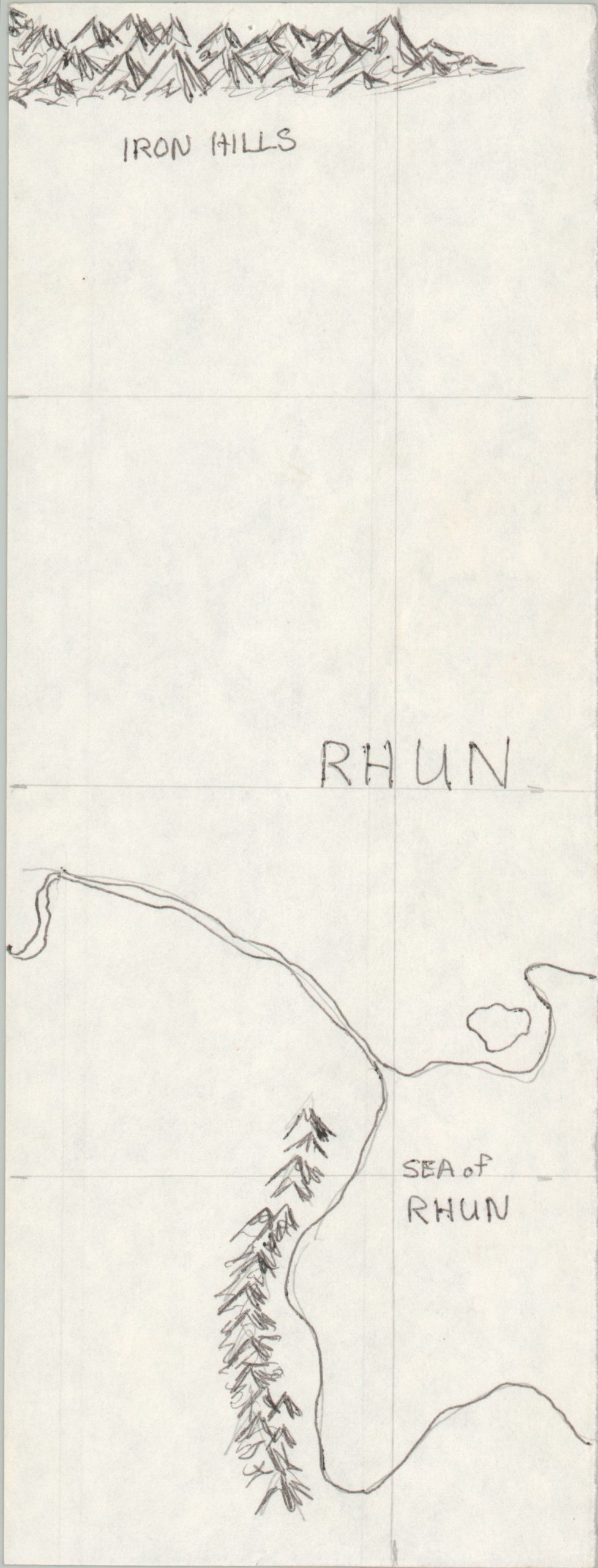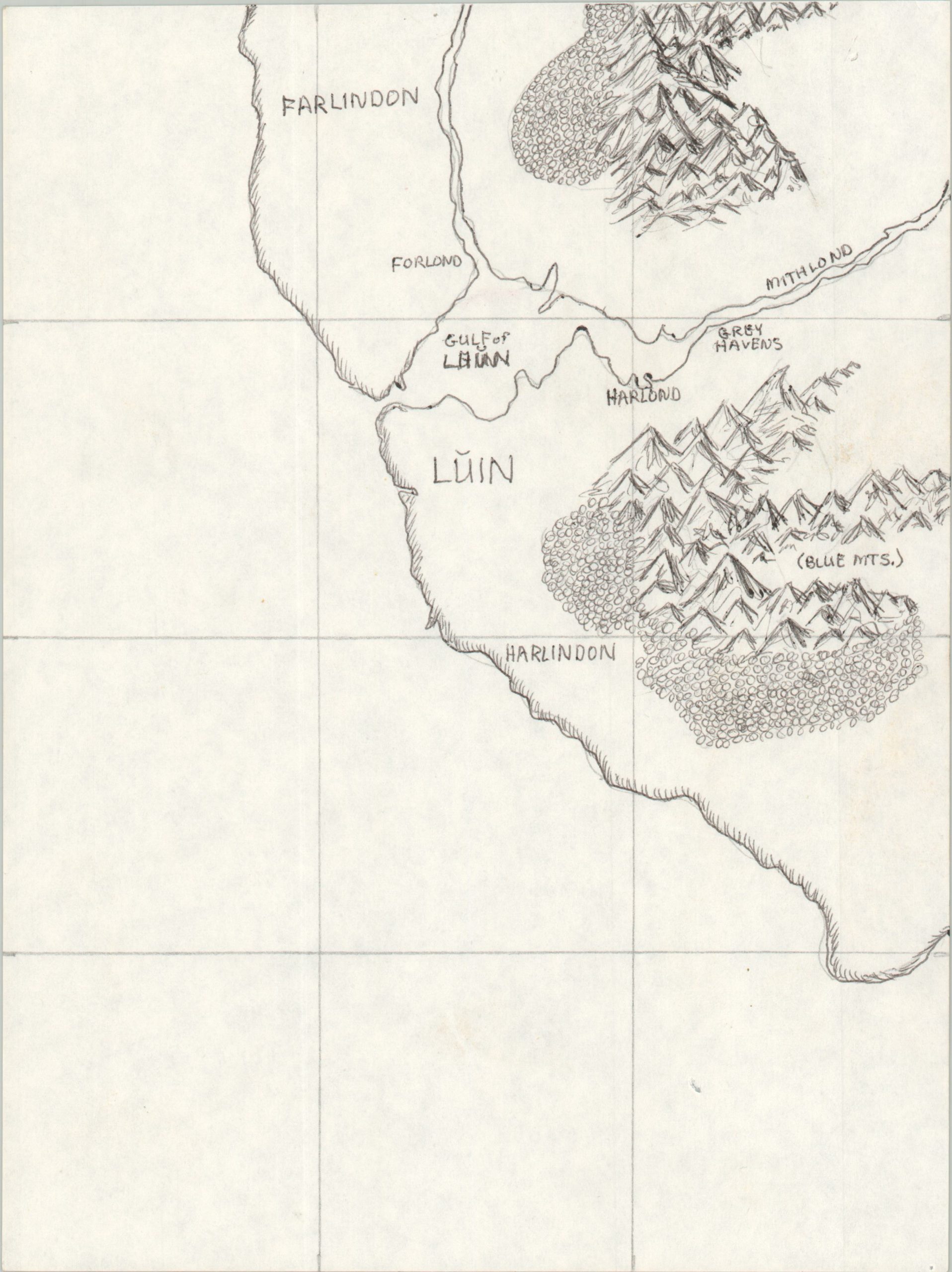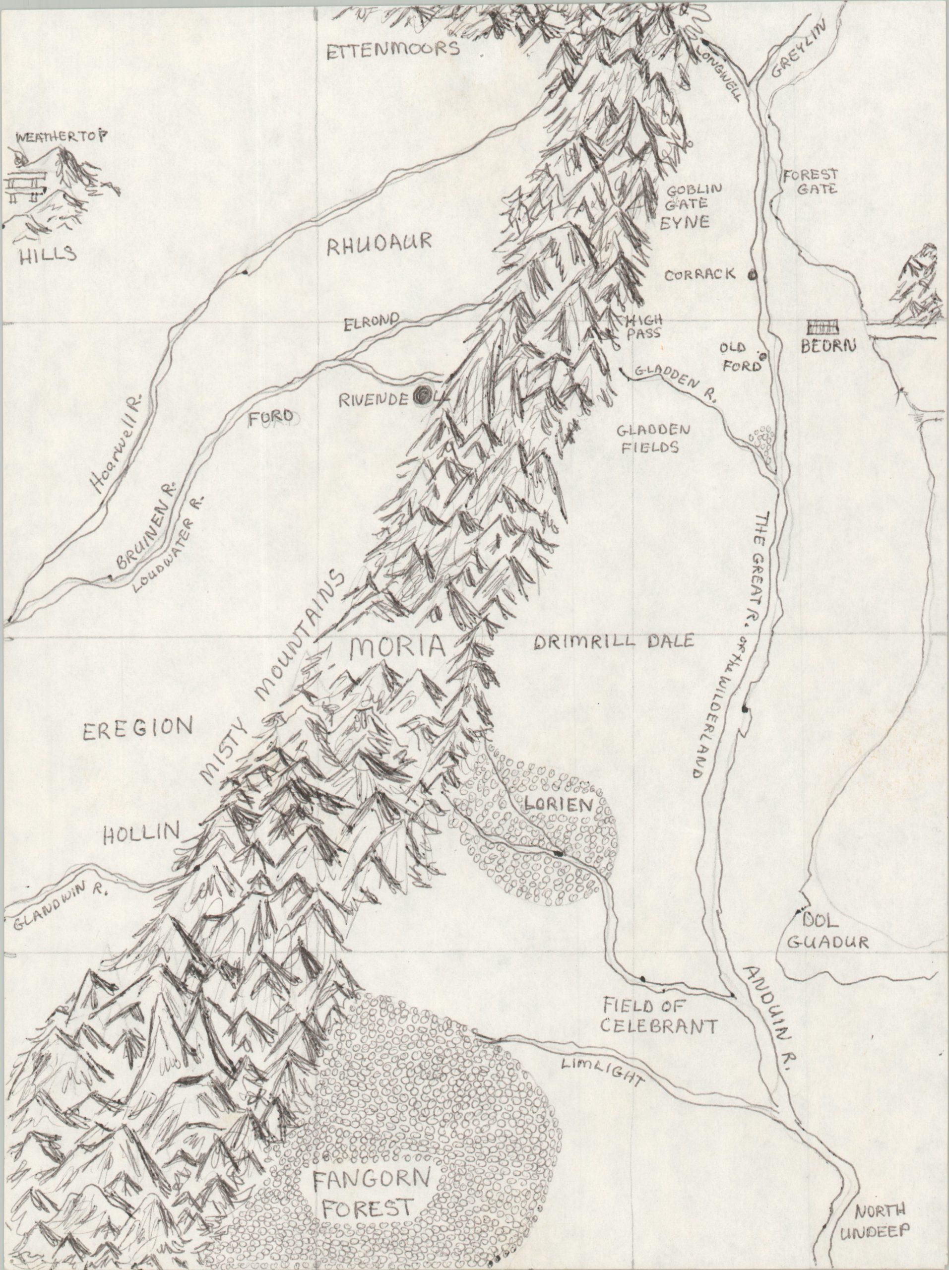 Based on the nature of the piece (pinholes, a penciled outline, precisely mapped features), I suspect that the piece was lovingly created for use in a Lord of the Rings Middle-earth Roleplaying Game, or perhaps even a homebrew campaign using the MERPG setting. This is supported by the addition of Umgard, south of Gondor, with its City of Corsairs.