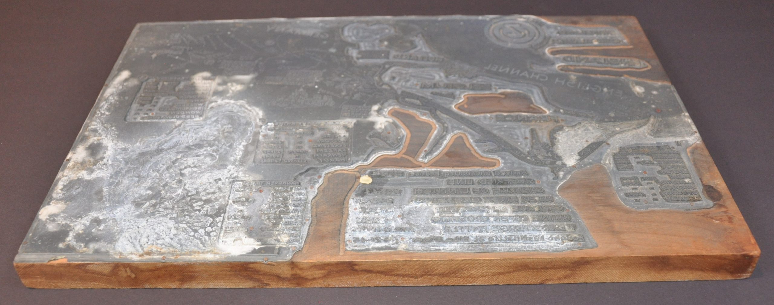 Condition Description: An incredible rarity - an original print block and a contemporary printed example of the resulting image. The block measures about 16" x 10.4" and features one large metal plate (likely zinc) securely affixed to a block of wood. White rust affects the corner in an area measuring about 7" x 7", plus the adjacent block of text (though this is raised in relief, so its less detrimental). Various other spotting and surface soiling throughout. The accompanying map (size given) is toned and lightly worn along the edges and features a vertical crease. Blank on verso.