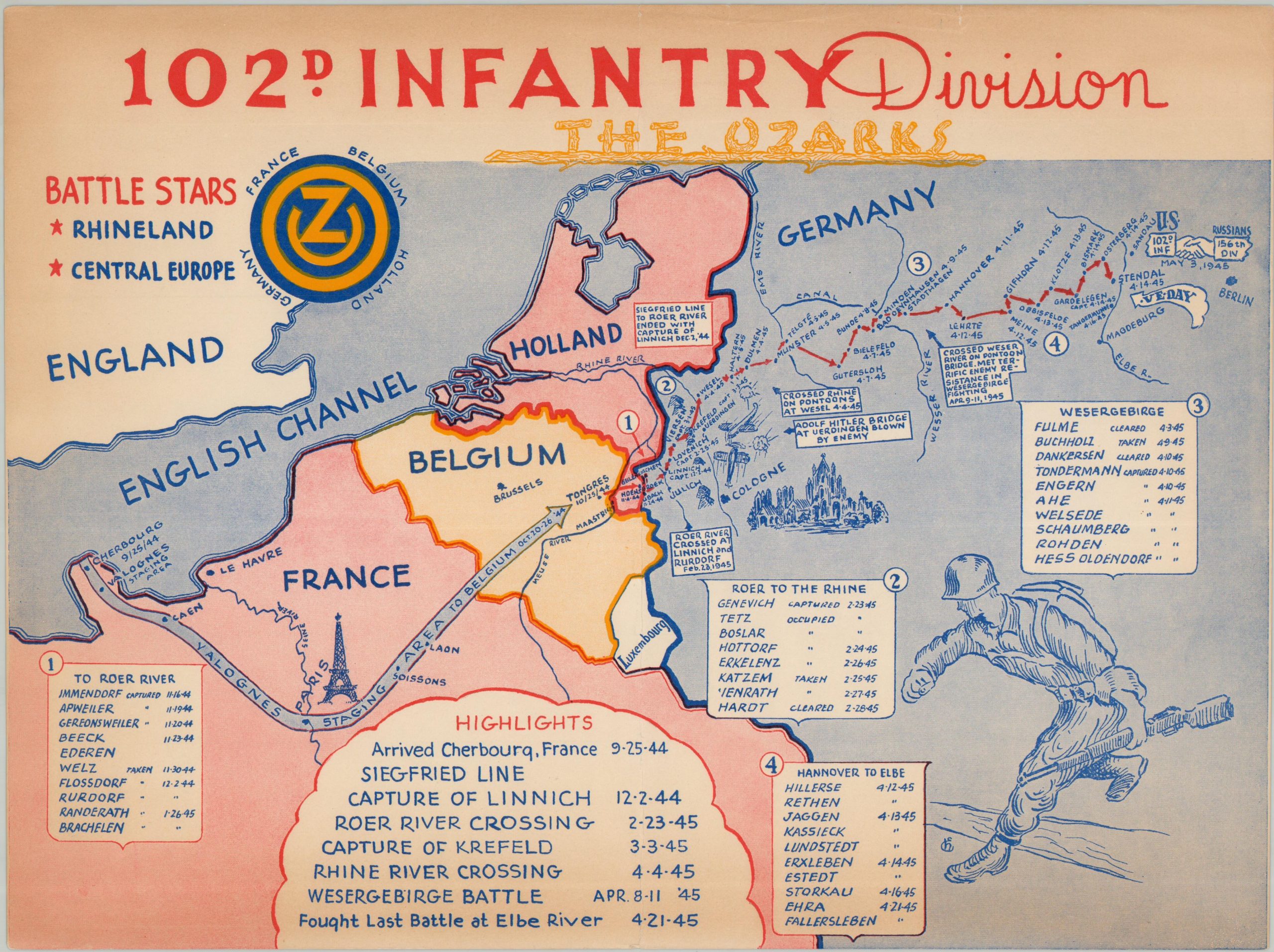 The movement of the division is illustrated on this pictorial map, distributed to unit members to commemorate their battle during WWII. Four separation groups of actions are noted with arrows, numbers, and accompanying lists of command headquarters. Simple drawings include an American G.I., the Eiffel Tower, and the Cathedral at Cologne. The highlights from the campaign are listed at the bottom and include the crossing of the Roer, the capture of Krefeld, and the last battle at the Elbe.