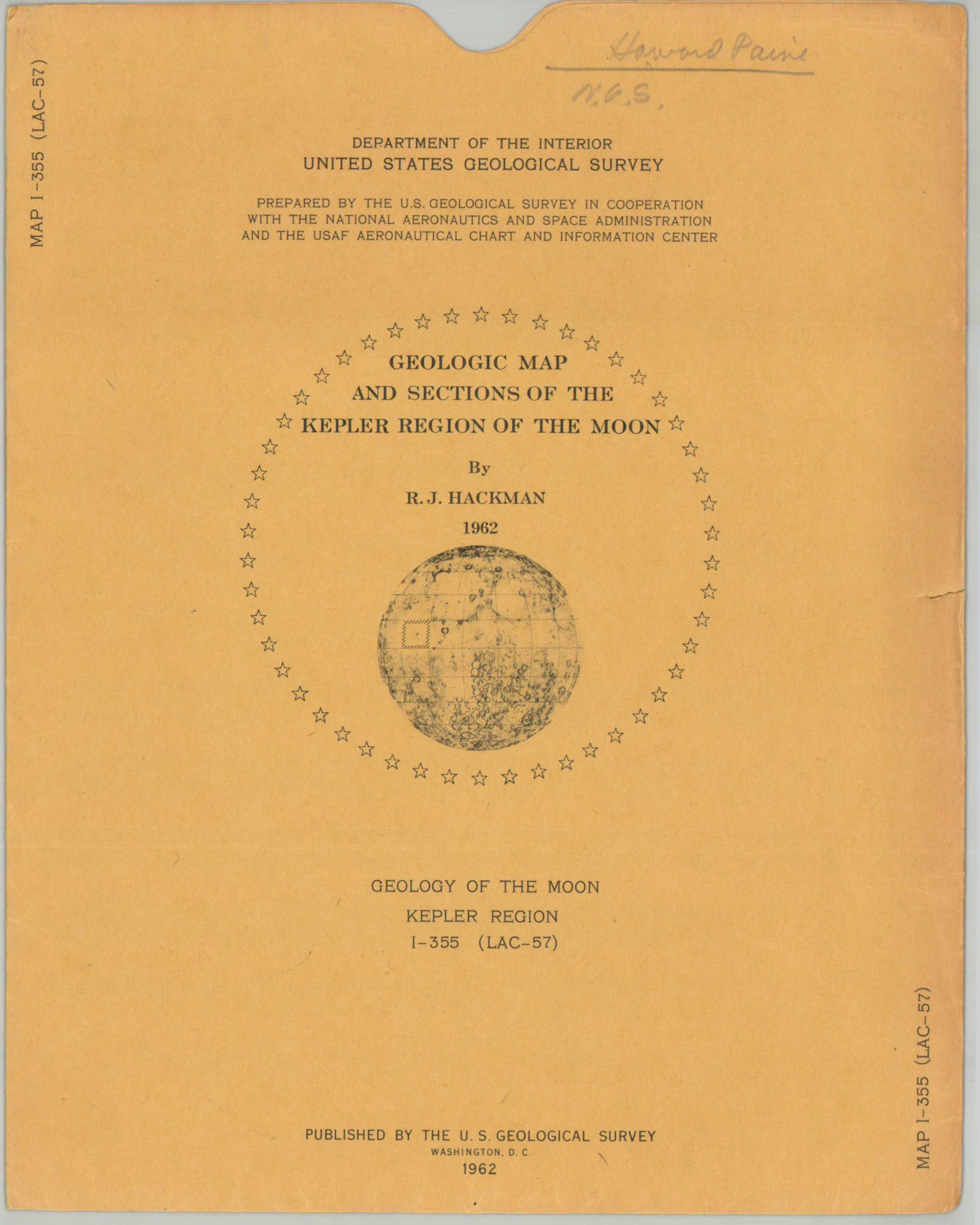 The map was published as plate I-355 (LAC-57) in the USGS Geological Atlas of the Moon, issued as a series of loose sheets over more than a decade. This example, signed on the original envelope, was owned by Howard Paine, former Art Director for the National Geographic Society. It was acquired directly from his widow.