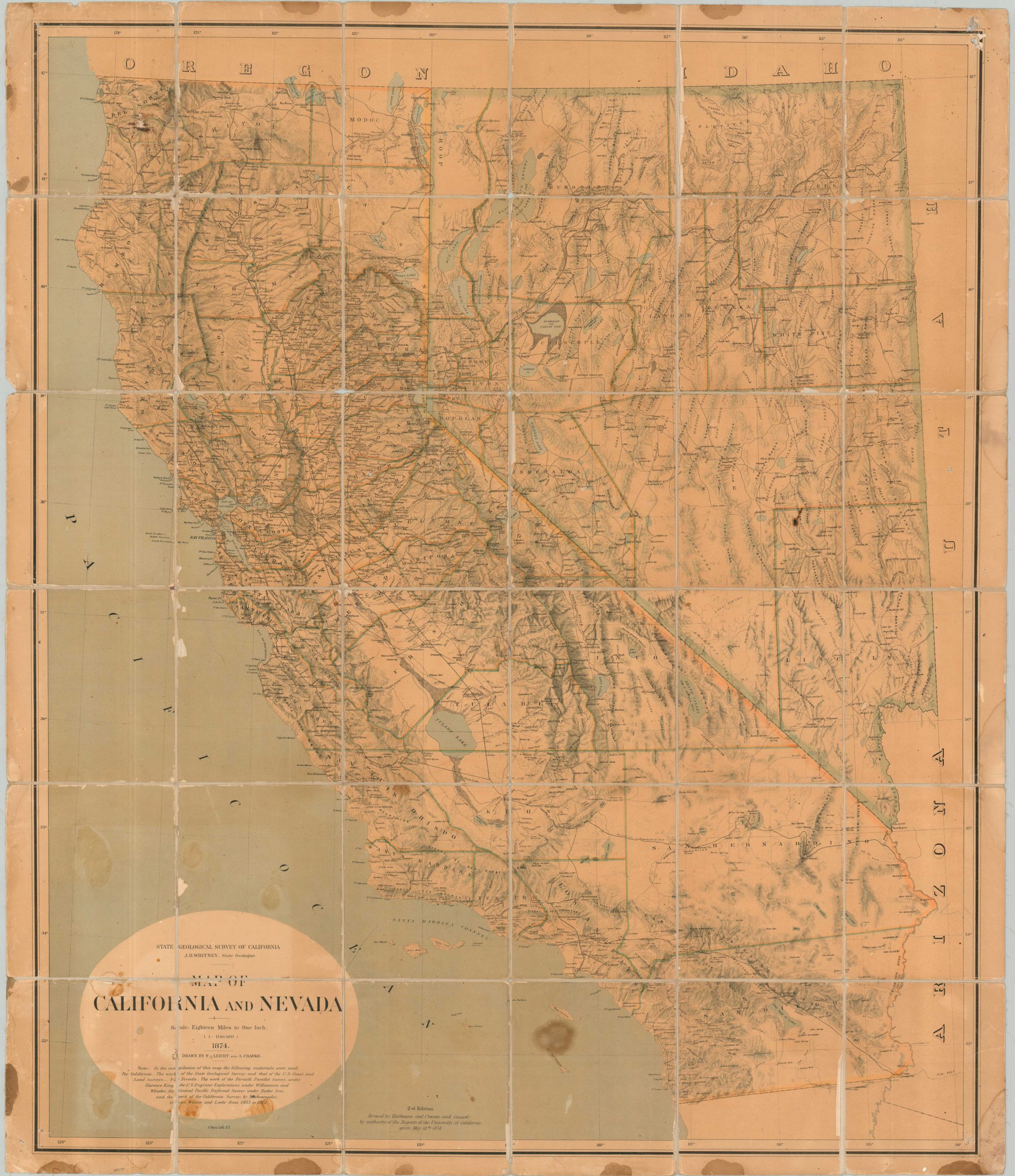 The first edition of the map was originally drawn by Alfred Craven and Ferdinand von Leicht in 1873. The authors diligently credited their sources below the title. This is the second edition, revised by Craven and Charles Hoffman and published by the authority of the University of California in 1874. Lithographed in New York by Julius Bien & Co.