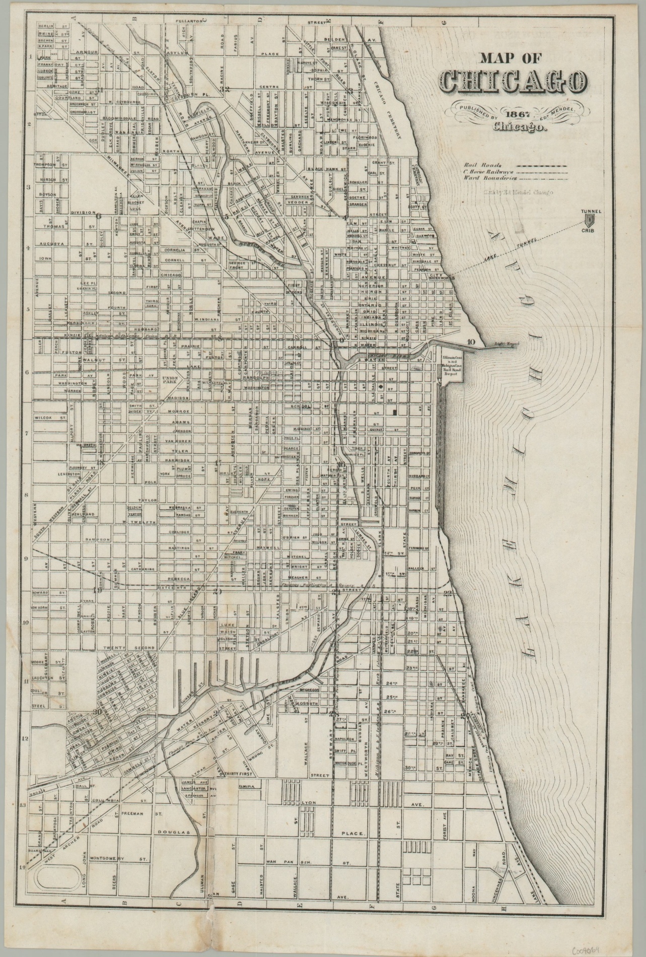It can hardly be suspected that the city of Chicago was less than four decades old at the time of this map’s publication in 1867. Limits extend from Egan Avenue in the south to Fullarton (sic) in the north and (appropriately) Western Avenue in the west.