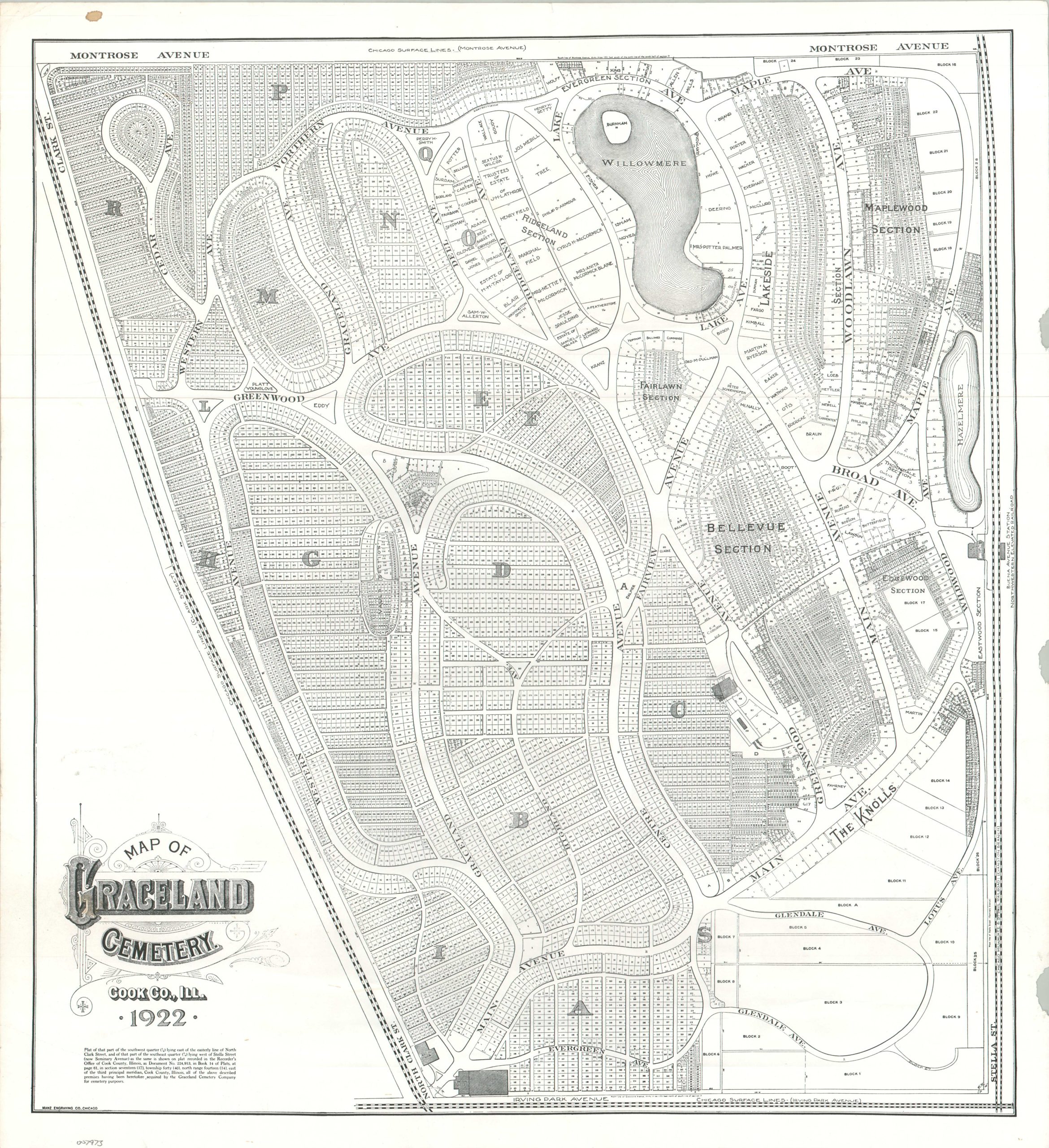 This detailed ground plan provides an intimate look at Chicago’s Graceland Cemetery during the early 1920s. The prominent burial ground was established in 1860 as part of the rural cemetery movement, where tranquil surroundings and winding paths would offer natural consolation for the bereaved. It became one of the preferred resting places for Chicago’s elite, as reflected by names like Marshal Field, Cyrus McCormick, Philip Armour, and Mrs. Potter Palmer.