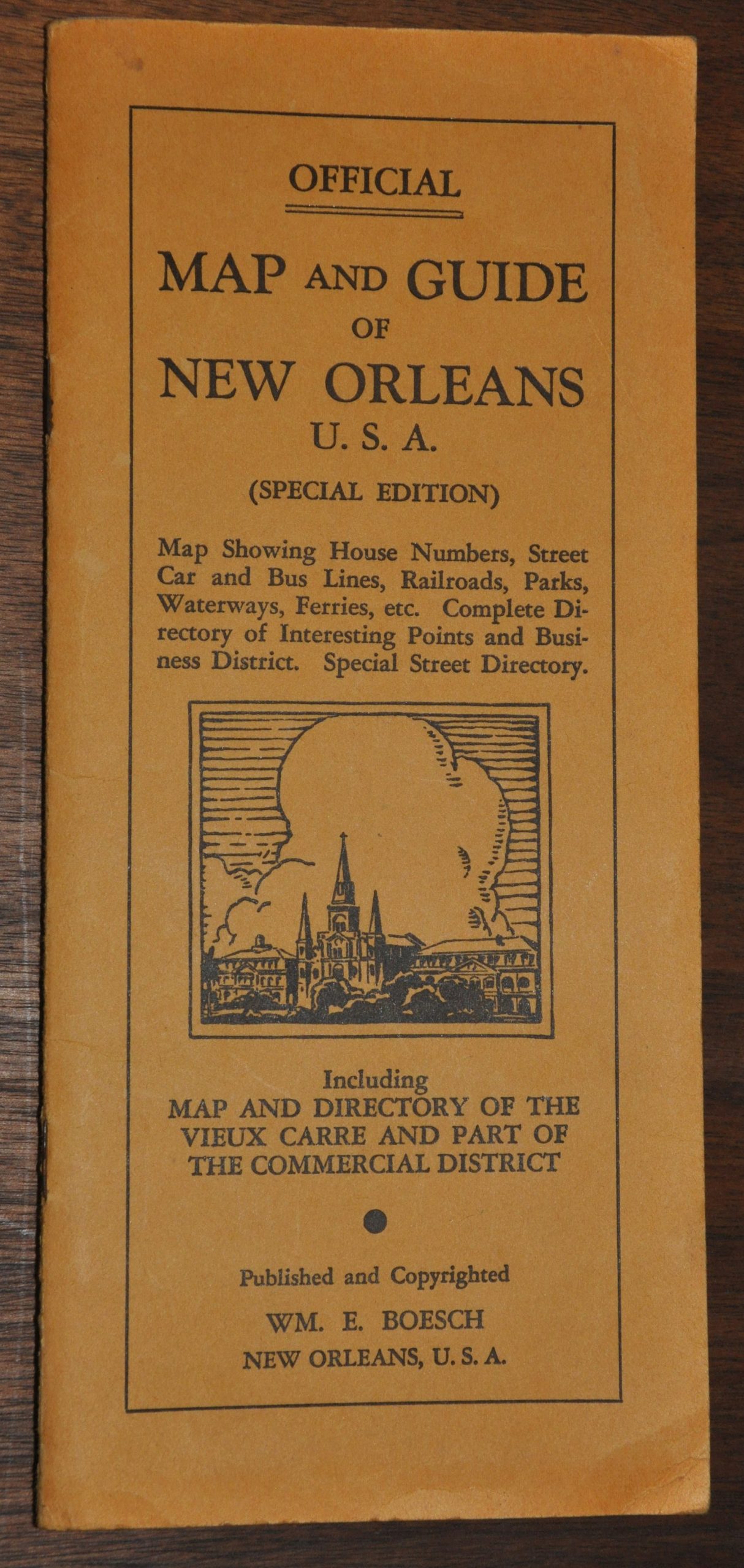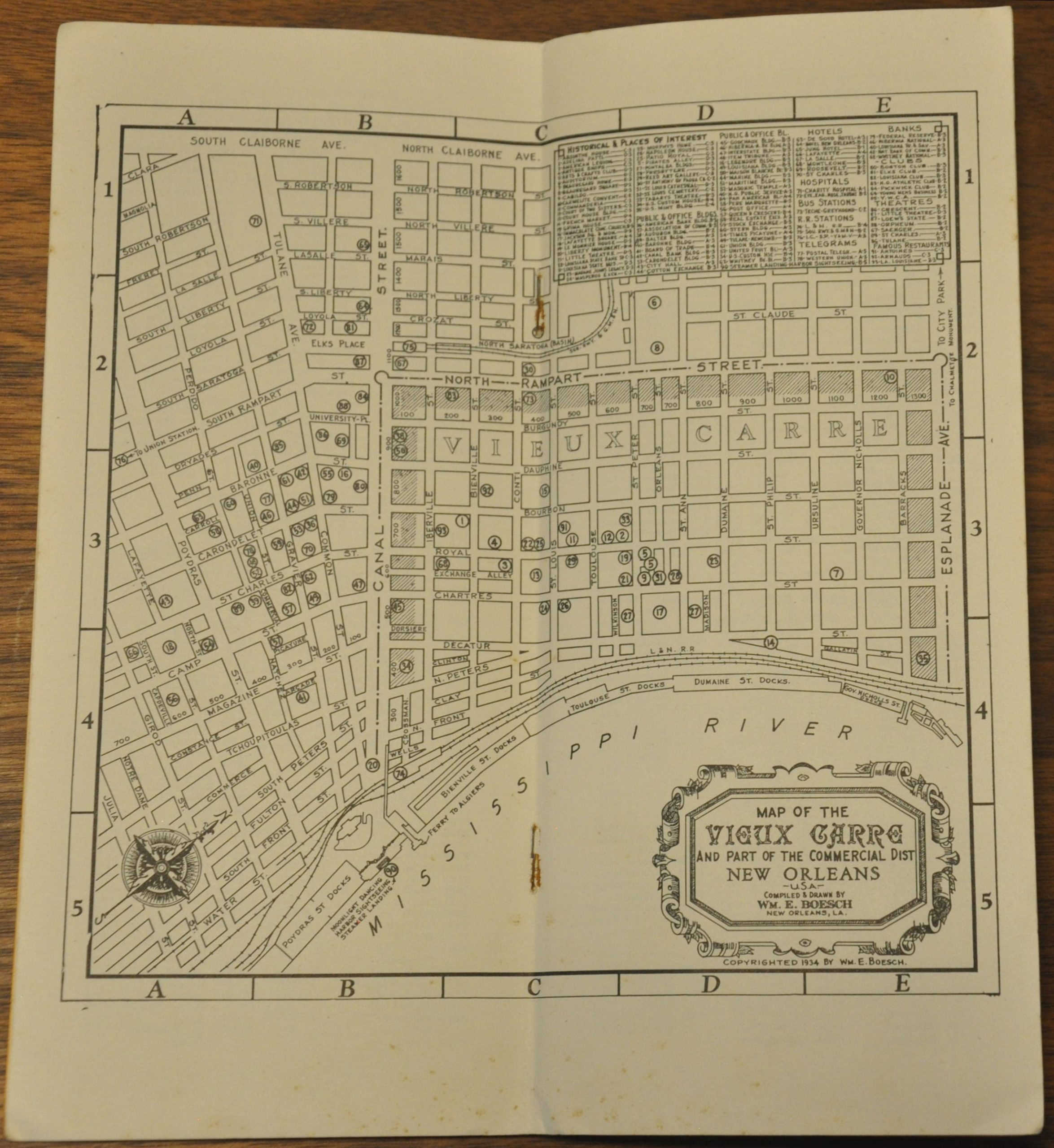 The folding map is affixed to a guidebook of the city that provides a street index, a map of the commercial district, and lists of places of interest. The centerfold ‘Map of The Vieux Carre’ was copywritten by Boesch in 1934, but the presence of the Huey P. Long Bridge on the fold-out indicates a date of at least 1935.