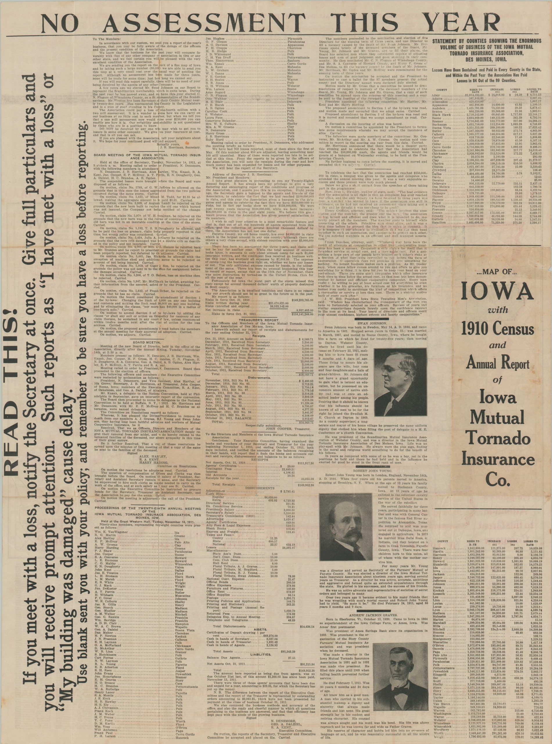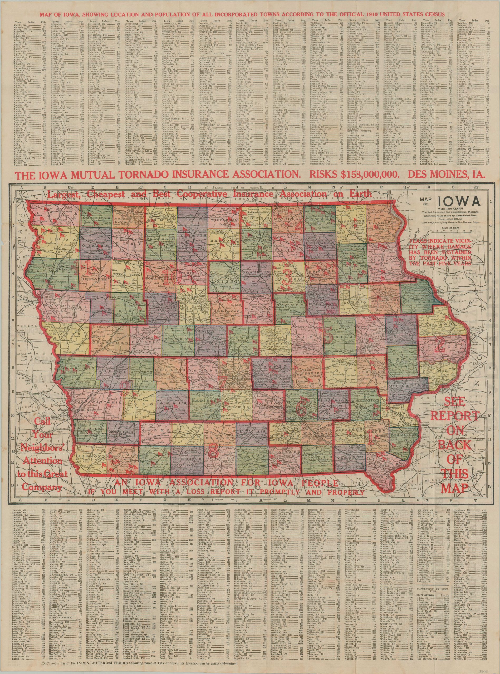 A comprehensive index of Iowa cities and towns, along with their respective populations from the 1910 census, is provided at the top and bottom of the page. The verso presents the Annual Report of the Iowa Mutual Tornado Insurance Co., which notes nearly 1,000 claims were made the prior year.