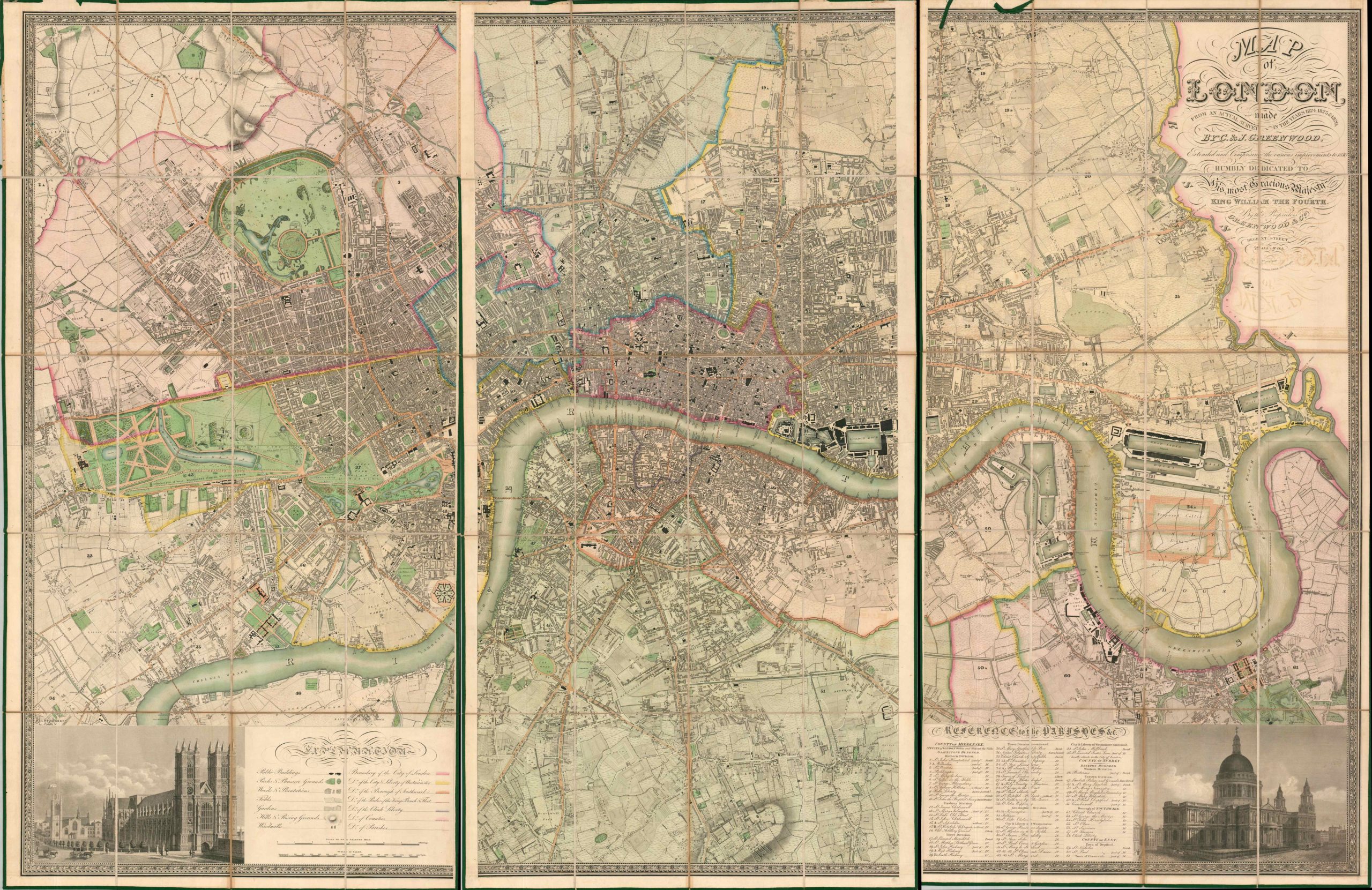 This magnificently detailed map of London was compiled by brothers Christopher & John Greenwood after they spent several years surveying the British capital – the hub of international trade and the largest city in the world at the time of publication. The dense image presents a wealth of information during a period of remarkable growth and transformation – population, industry, and the physical footprint all expanded greatly during the 19th century. Such growth was predicated on the availability of foodstuffs from the countryside and the construction of massive dock/shipbuilding facilities, both clearly represented within the decorative border.
