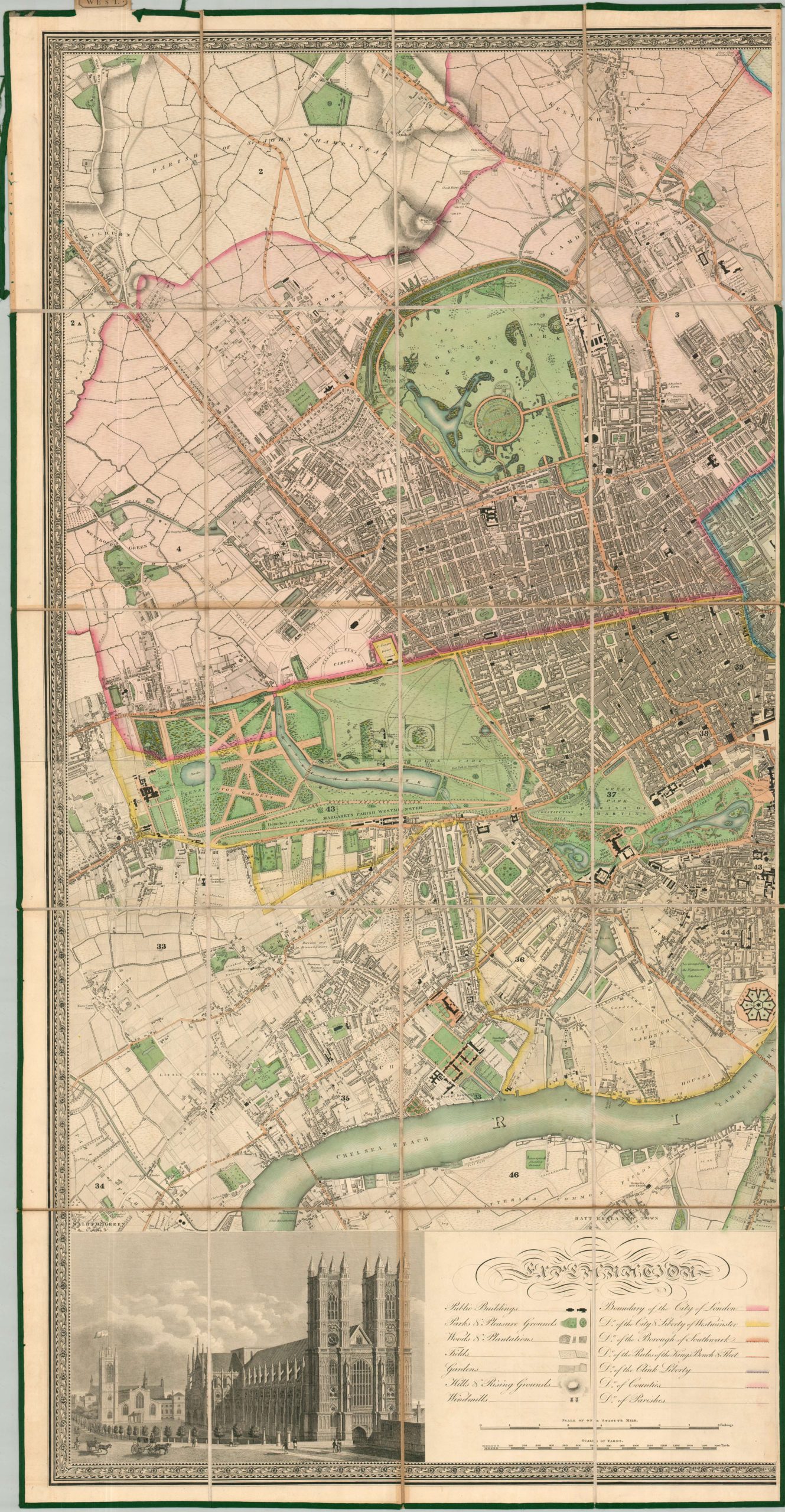 The map presents London and the surrounding suburbs across three sheets, from the Isle of Dogs and its extensive dockyards to Kensington Gardens. Various boundaries (city, county, parishes, etc.) are brightly colored, along with parks and pleasure grounds in vibrant green. Windmills, fields, gardens, and public buildings are among the features identified in the legend (lower left). Notable recent construction includes St. Pancras New Church (1822), the British Museum (1823), Regent’s Street (1827), ongoing work on the Thames Tunnel, improvements to St. James Park, and a nearly completed London Bridge (adjacent to the old one). Less-famous, but still certainly interesting, contemporary landmarks include the Surrey County Gaol (a public execution site), Daguerre and Bouton’s diorama in Regent’s Park, and a workhouse in the infamous slum of St. Giles. Elegantly engraved scenes in the lower corners show two of London’s most iconic landmarks – Westminster Abbey (lower left) and St. Paul’s Cathedral (lower right).