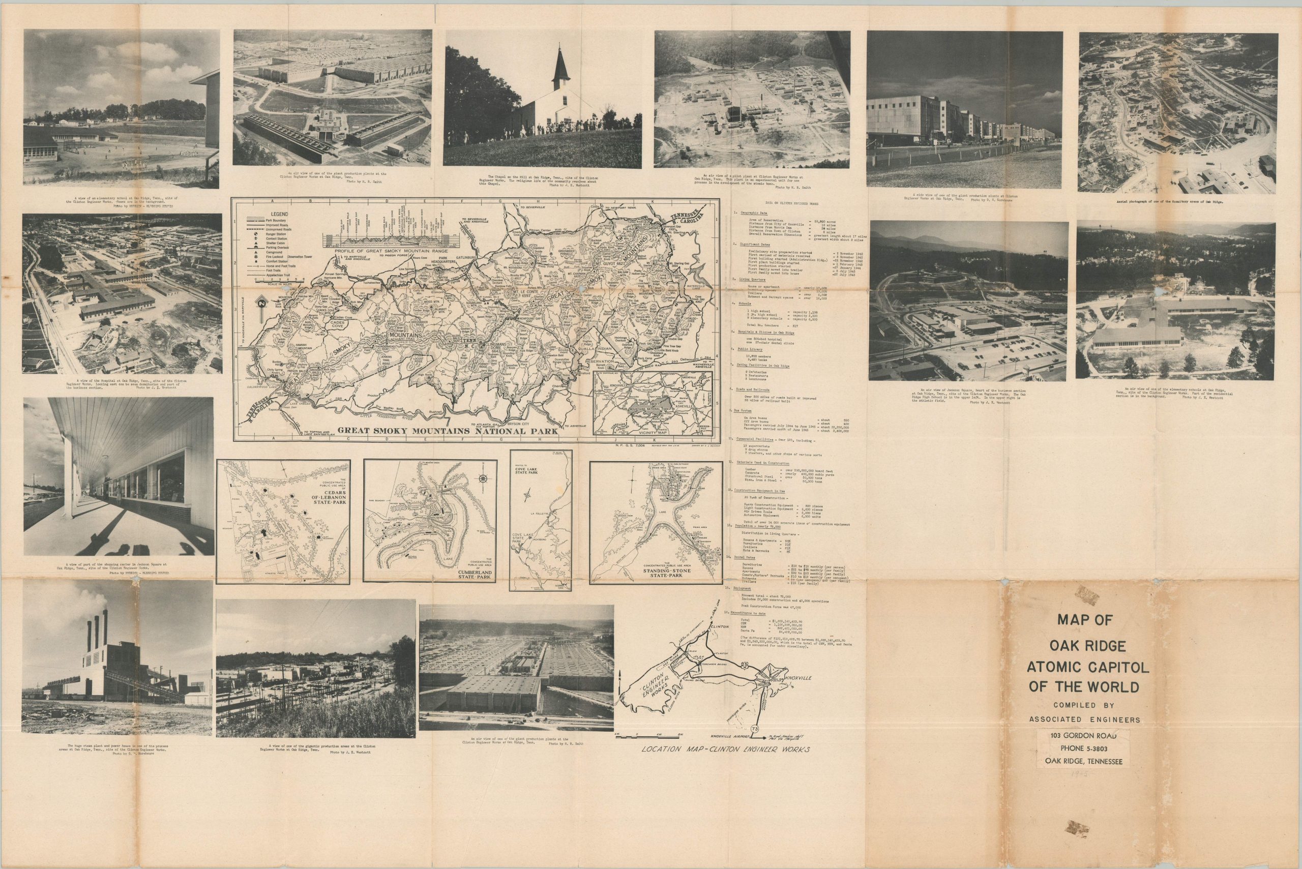 This map, perhaps one of the earliest that was publicly issued, shows this ‘secret city’ as it first emerged from the shadows of the Manhattan Project. The lower half of the sheet presents a map of the area surrounding the Clinton Engineer Works (brightly highlighted in red). Immediately above is a street plan of Oak Ridge, noting the various bus lines in operation and accompanied by a street directory. The verso of the sheet offers a map of Great Smoky Mountains National Park, plus small plans of several local state parks. Captioned photographs show different facilities, including production plants, dormitories, a shopping center, and a steam plant.
