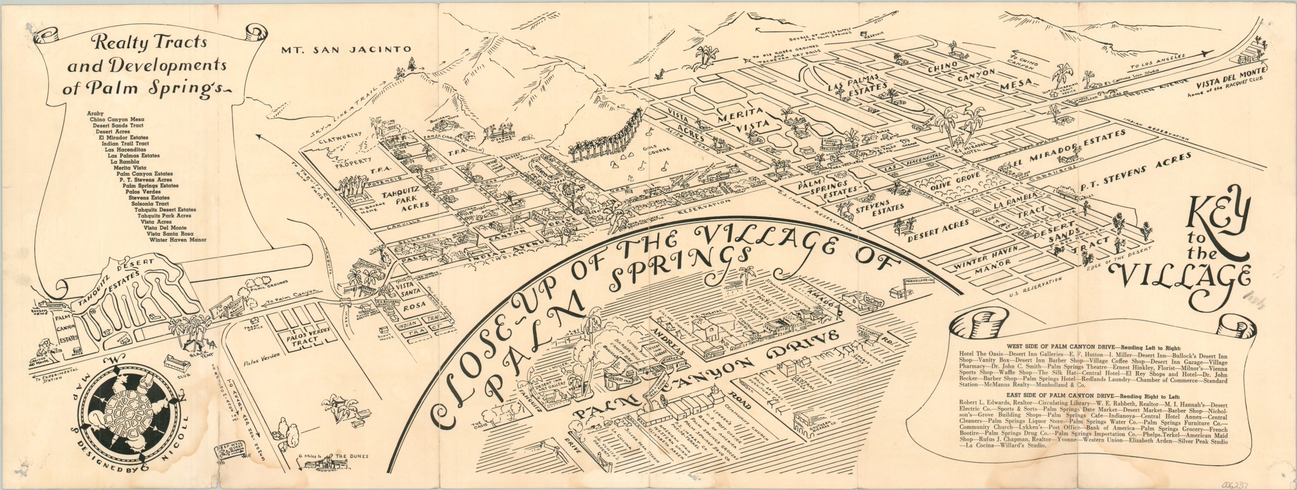 This charming pictorial view of Palm Springs, California was illustrated by Bee Nicoll as part of a promotional brochure compiled by the Palm Springs Printing Company. Oriented with west at the top, the image presents the idyllic desert oasis during a period of significant development. Palm Springs was becoming increasingly popular with movie stars, the health-conscious, and tourists looking to gamble, golf, and gawk at the impressive homes (many of which are named).