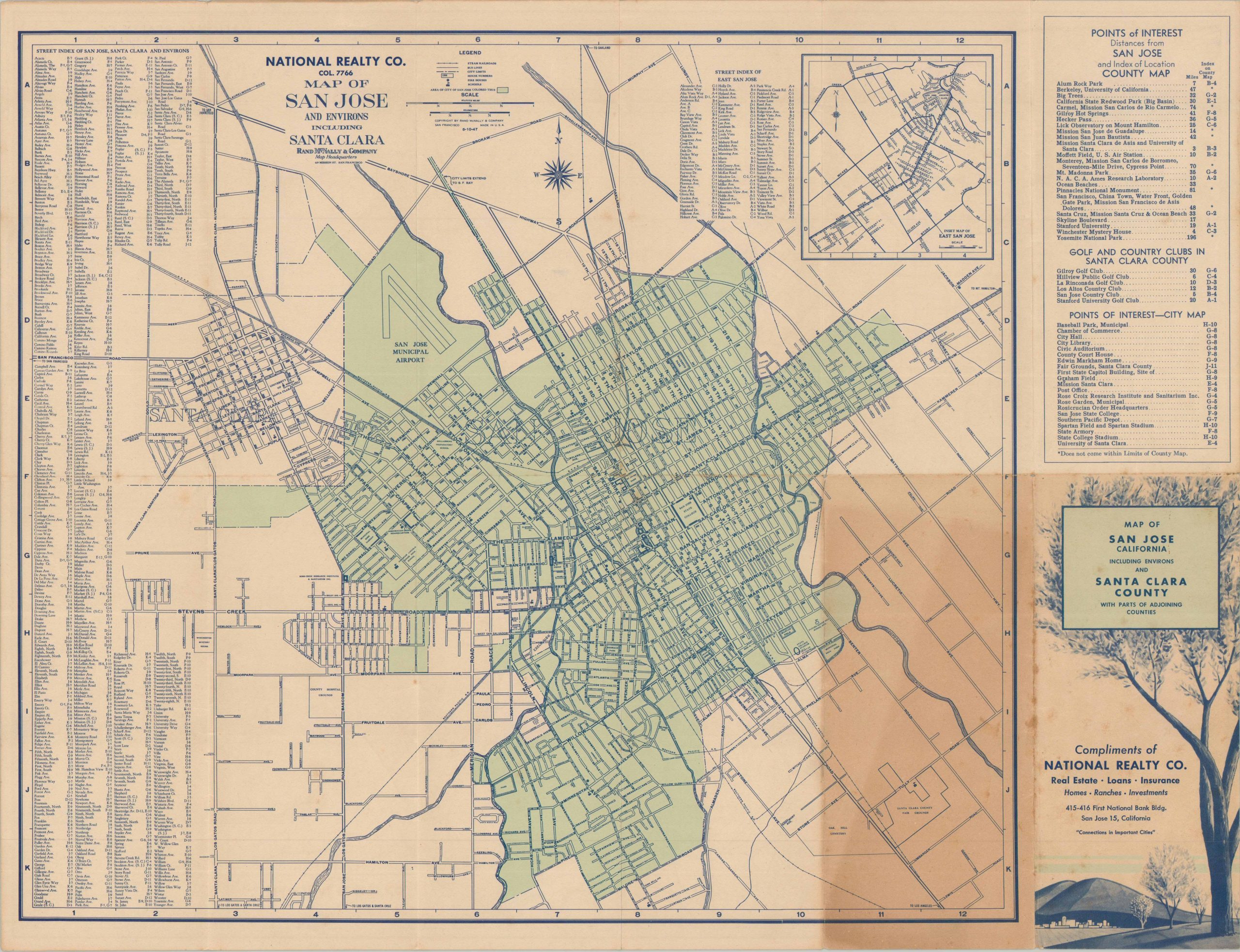 This detailed map of Santa Clara County, California, was created by Rand McNally of Chicago in 1947 and distributed courtesy of the National Realty Co. The postwar years saw a surge in settlement across San Francisco’s southern suburbs, though the region has yet to attain the urban character by which it is best known today.