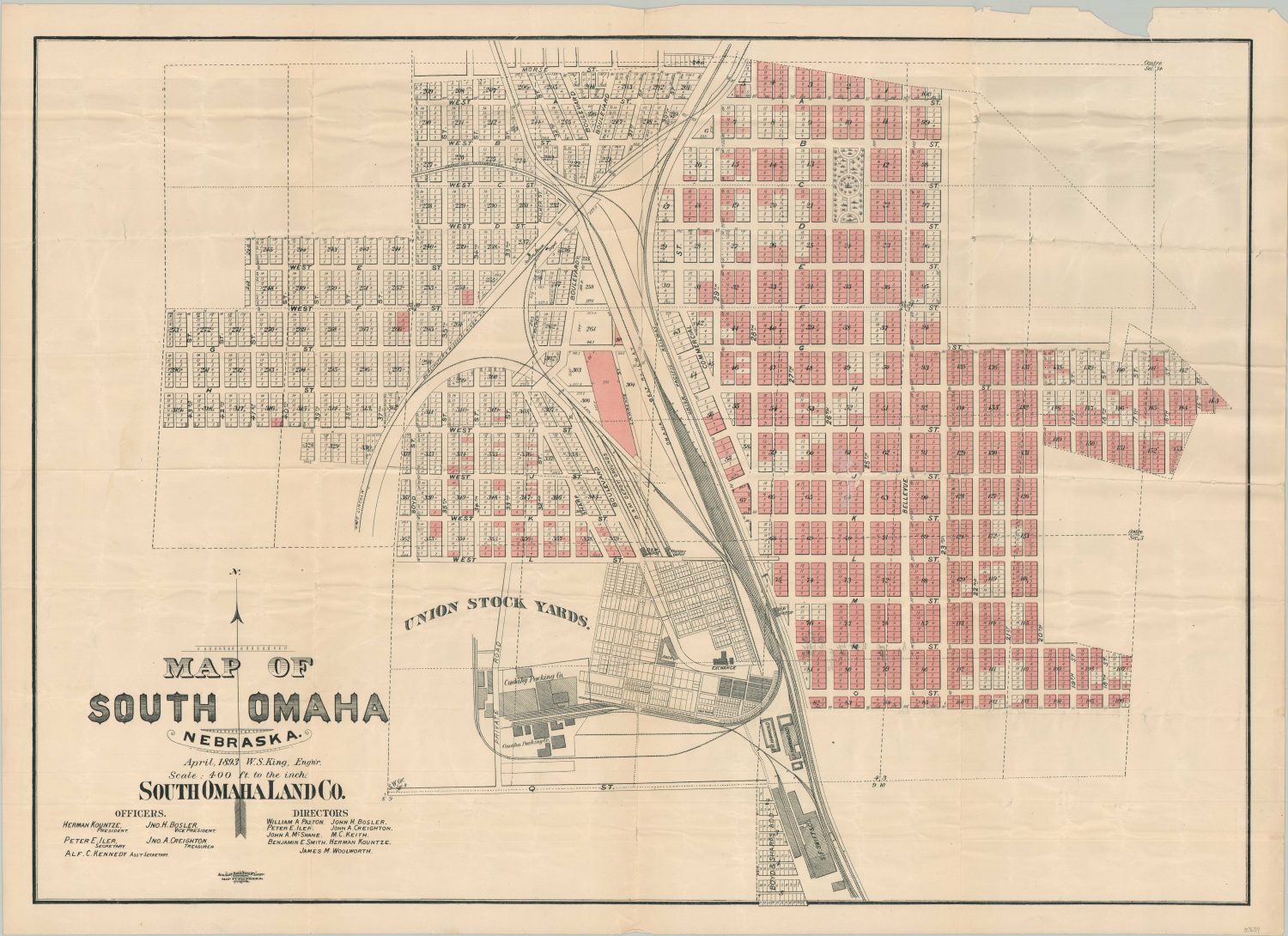 This map was designed in 1893 by City Engineer W.S. King on behalf of the South Omaha Land Company. The image shows densely packed residential districts (home to mostly immigrant communities) subdivided into small lots and nestled around massive railway and meatpacking facilities. Swift & Co., G.H. Hammond, Omaha Packing Co., and Cudahy Packing Co. (formerly Armour) are four of the major operators labeled.
