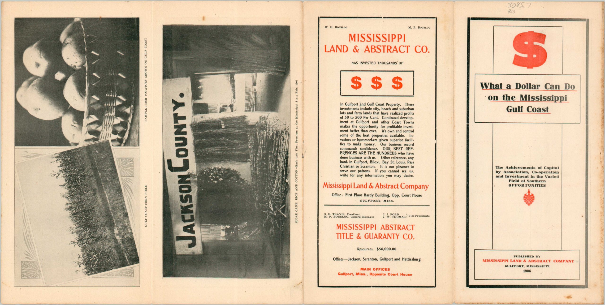 “Mississippi Land & Abstract Co. has invested thousands of [dollars] in Gulfport and Gulf Coast Property. These investments include city, beach and suburban lots and farm lands that have realized profits of 50 to 500 Per Cent. Continued development at Gulfport and other Coast Towns makes the opportunity for profitable investment better than ever.” – Text, back panel.